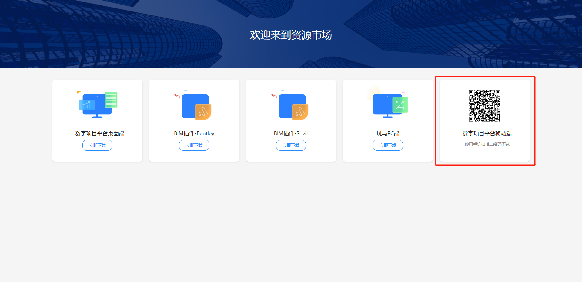 下载方式一:登录https://pm.sxjgkg.com/login/在网页右上角点击【资源下载】,跳转进入下载页面,安卓或IOS用户可使用手机扫描“数字项目平台”下方二维码即可下载移动端APP。