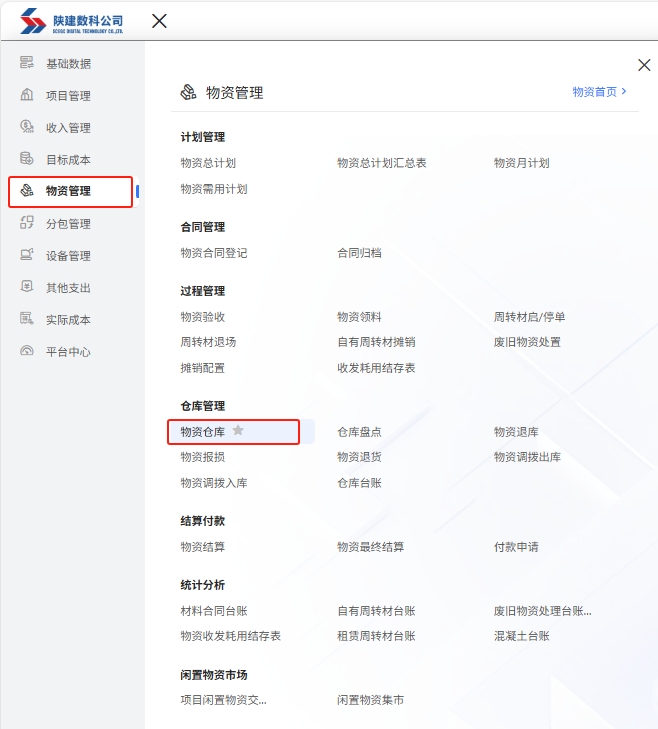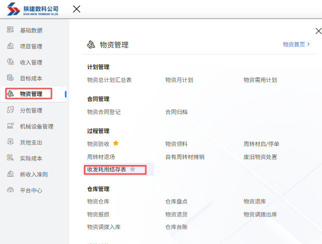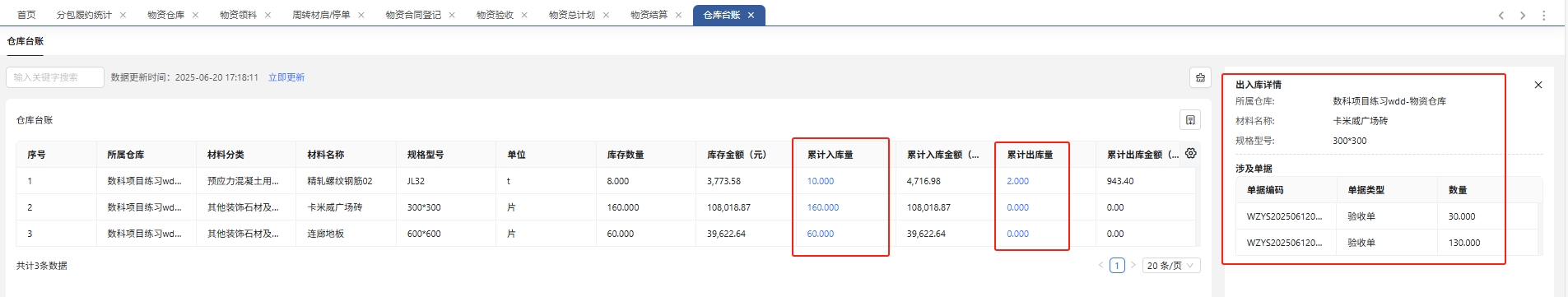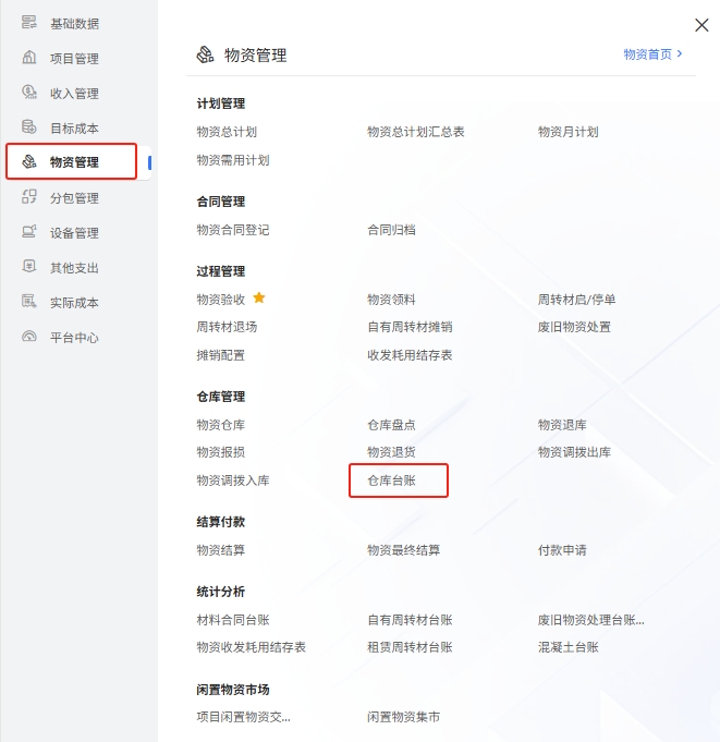 在物资板块下,仓库管理--仓库台账,此台账根据出入库单据时时生成,可时时查看库存情况