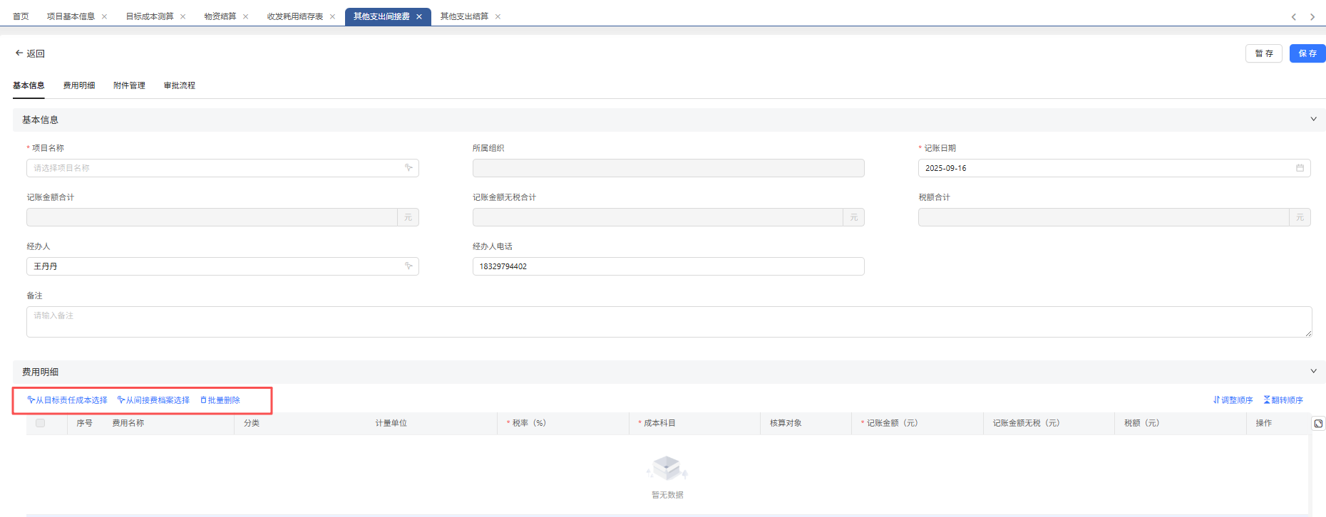 其他支出间接费直接从间接档案或目标责任成本中选择