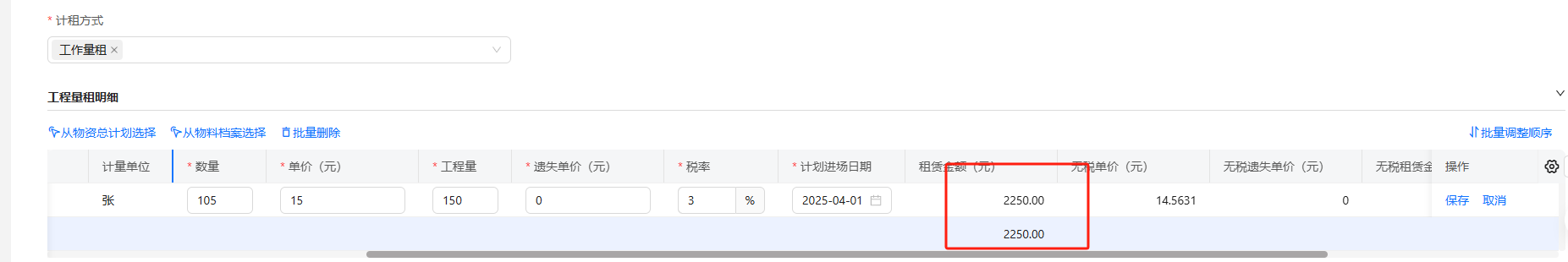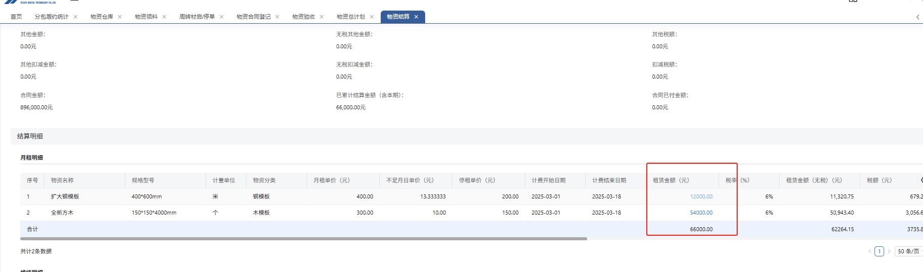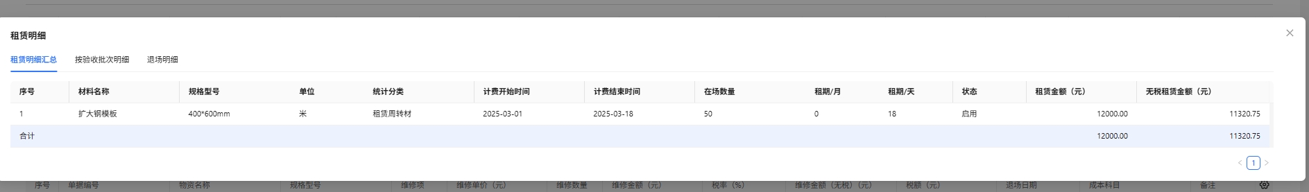 在物资结算明细表,点击结算金额,即可打开对应租赁材料的计算明细