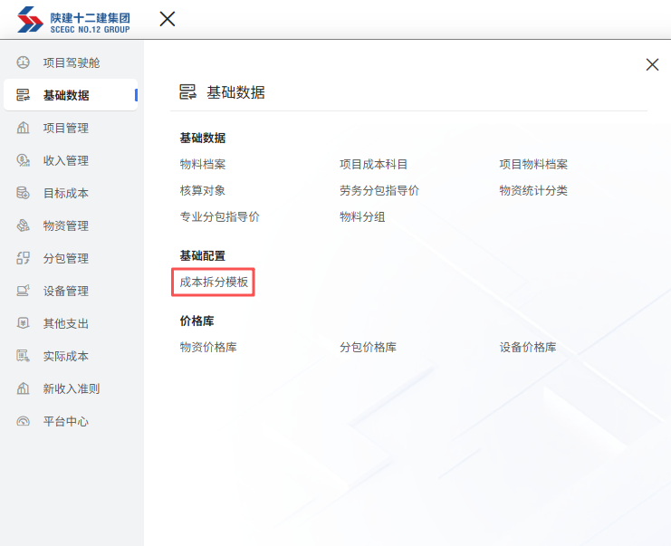 ②点击菜单平台中心---基础数据---基础配置下的成本拆分模板