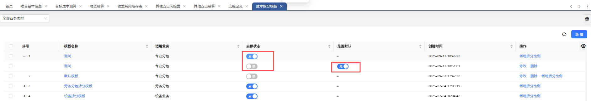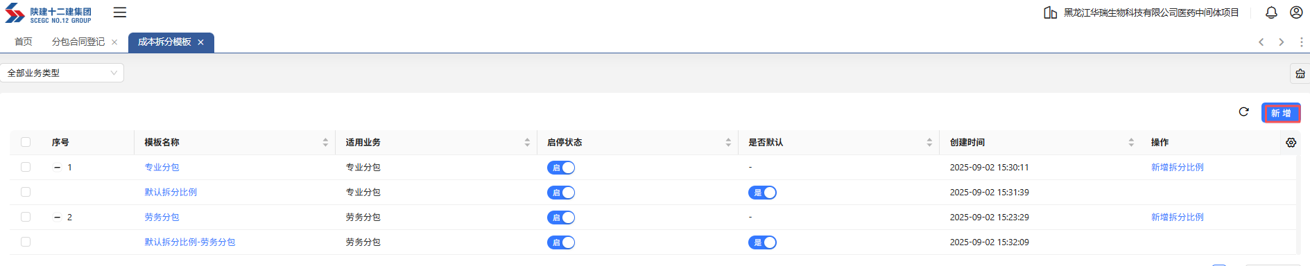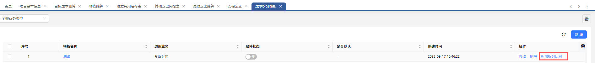 ⑤列表页面找到对应的模版名称,点击新增拆分比例,进入拆分比例页面