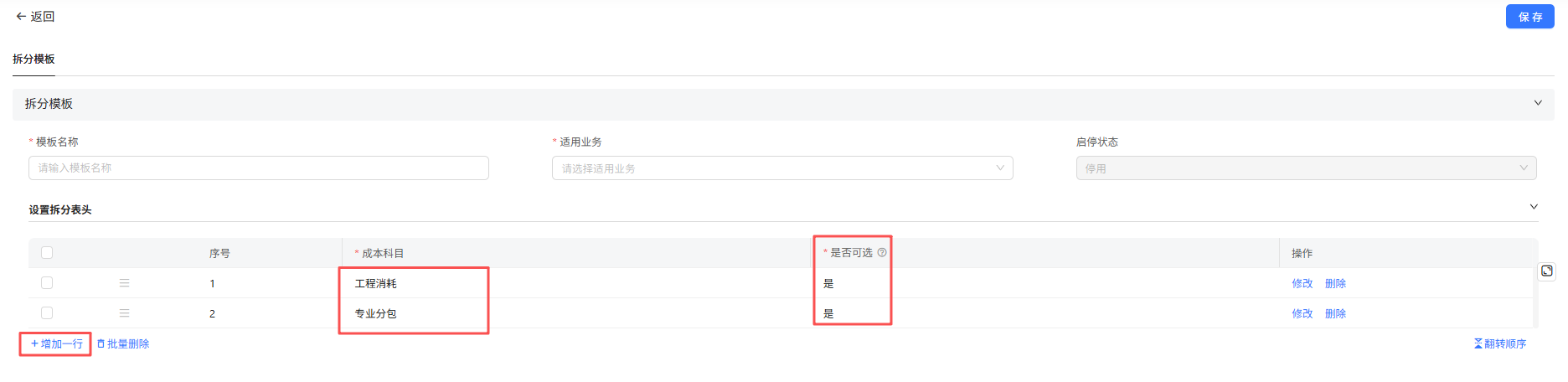 ④添加对应的成本科目,选择是否可选(可选指的是能否在结算单据中的成本拆分比例中的选项中能否选择到),点击保存