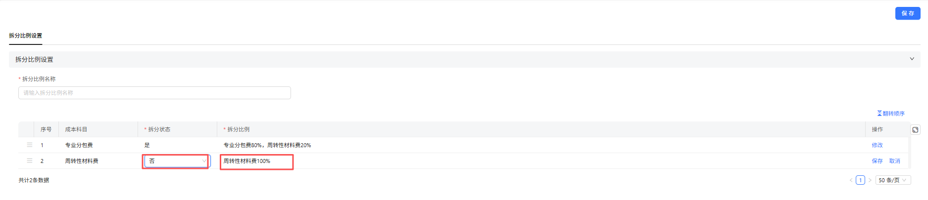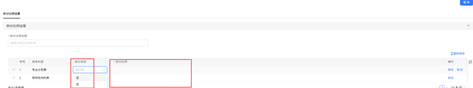 ②拆分状态为“否”,默认拆分比例为100%,点击保存