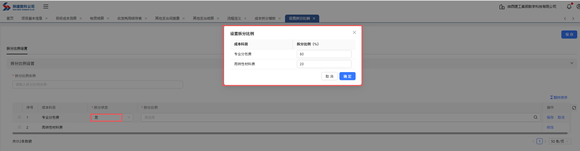 ⑥对上面设置的成本科目,设置拆分状态及拆分比例