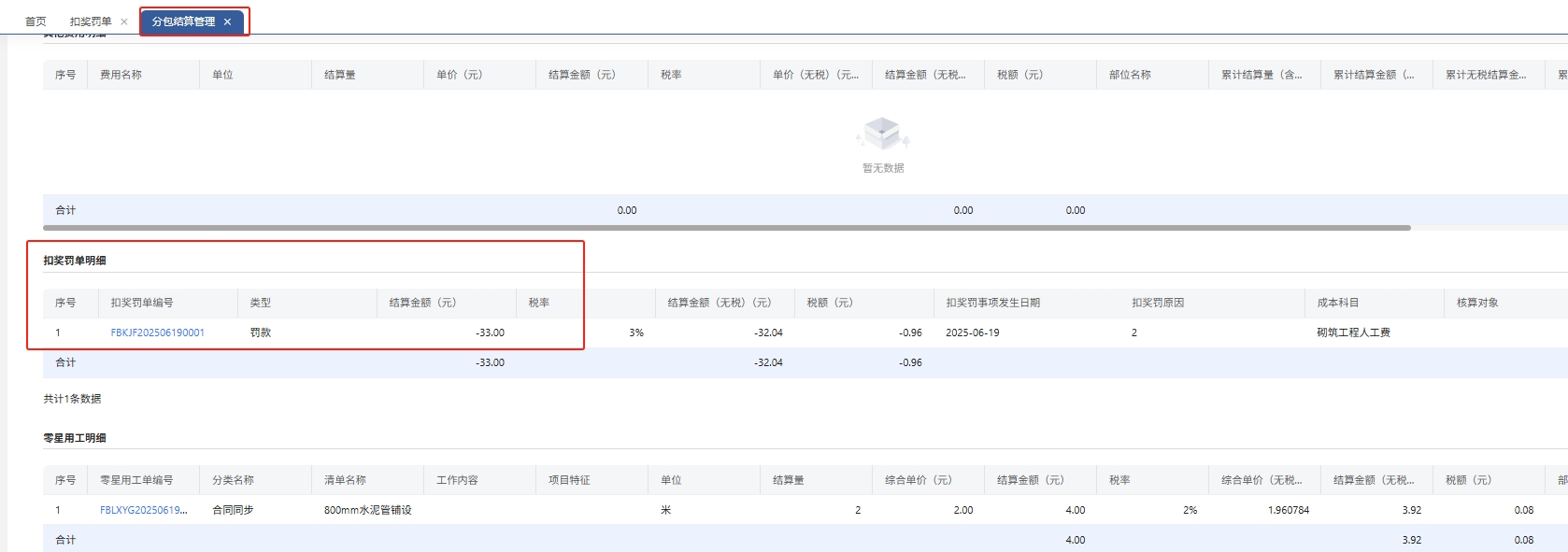 1)在分包管理下,通过扣奖罚单进行登记,确定罚款金额及原因