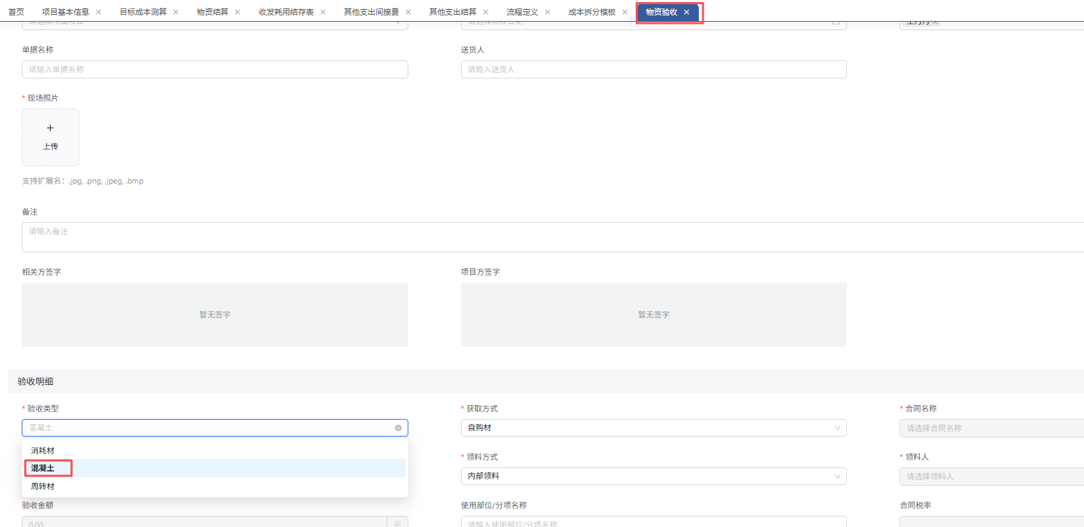 先正常走物资验收--无合同进场,后续有合同后完成合同补录。业务结算时选择对应和合同和验收资料不影响结算。