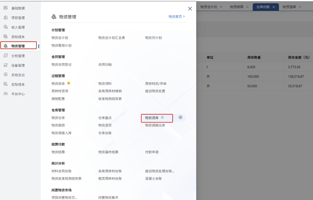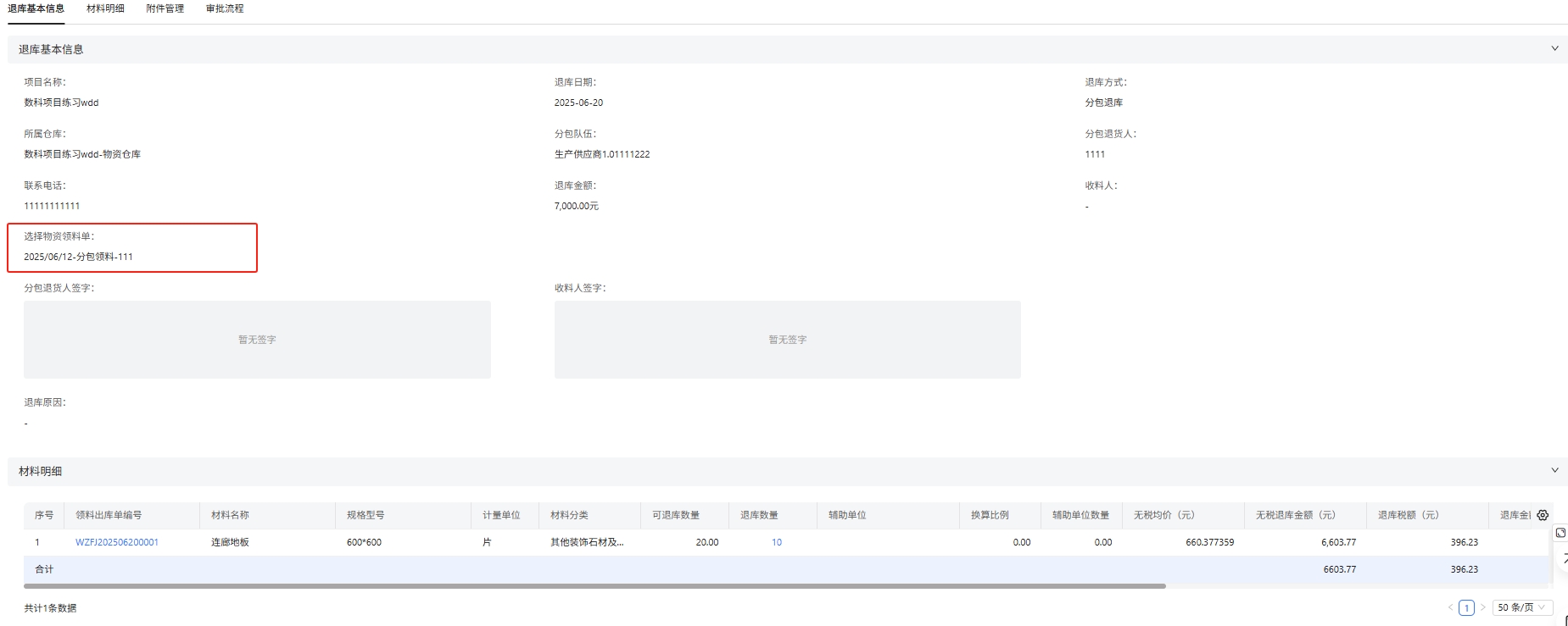 在物资板块下,可通过物资退库业务进行,选择对应的物资领料单据,填入需要退库的数量及仓库即可