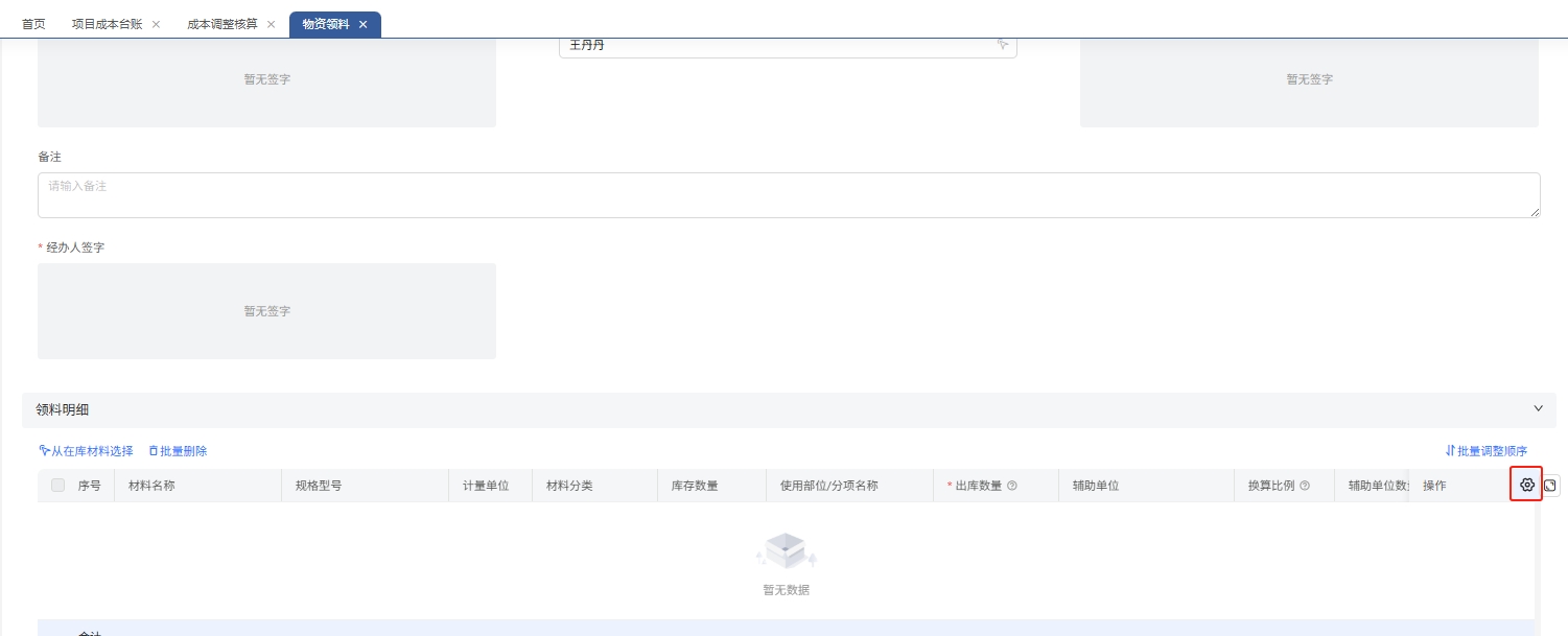 如果是记录工程成本的,做虚拟合同正常验收、领料记成本。