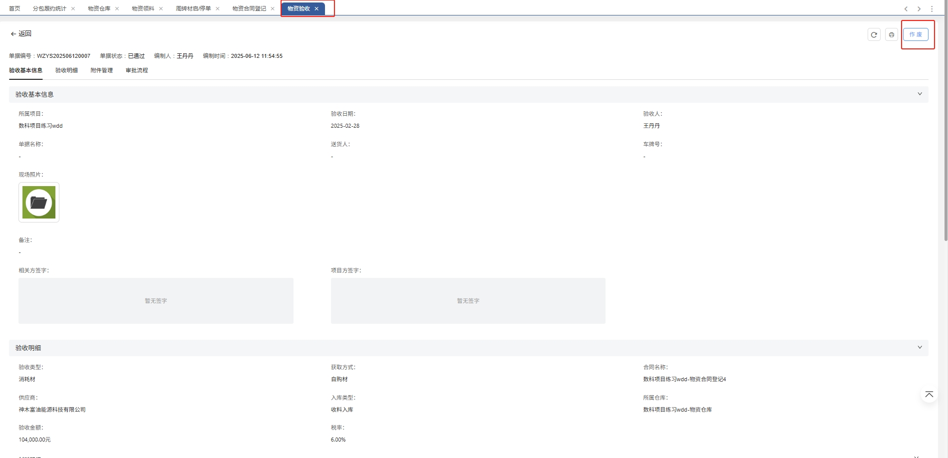 如果此条验收单据尚未进行领料或者结算的引用,可以在表单页面右上角点击作废处理