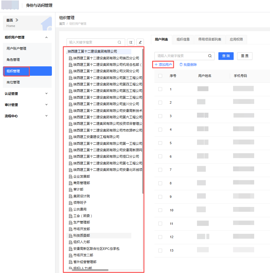 ②进入统一身份认证系统中,点击后台管理之后,选择组织用户管理下的组织管理中,左侧菜单选择对应的组织架构(如:陕西建工第十二建设集团有限公司)后,点击添加用户后在对应的集团层级添加用户