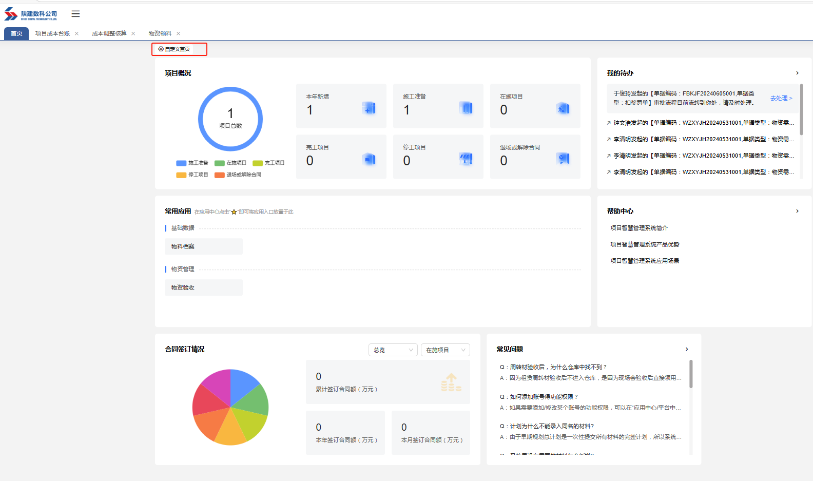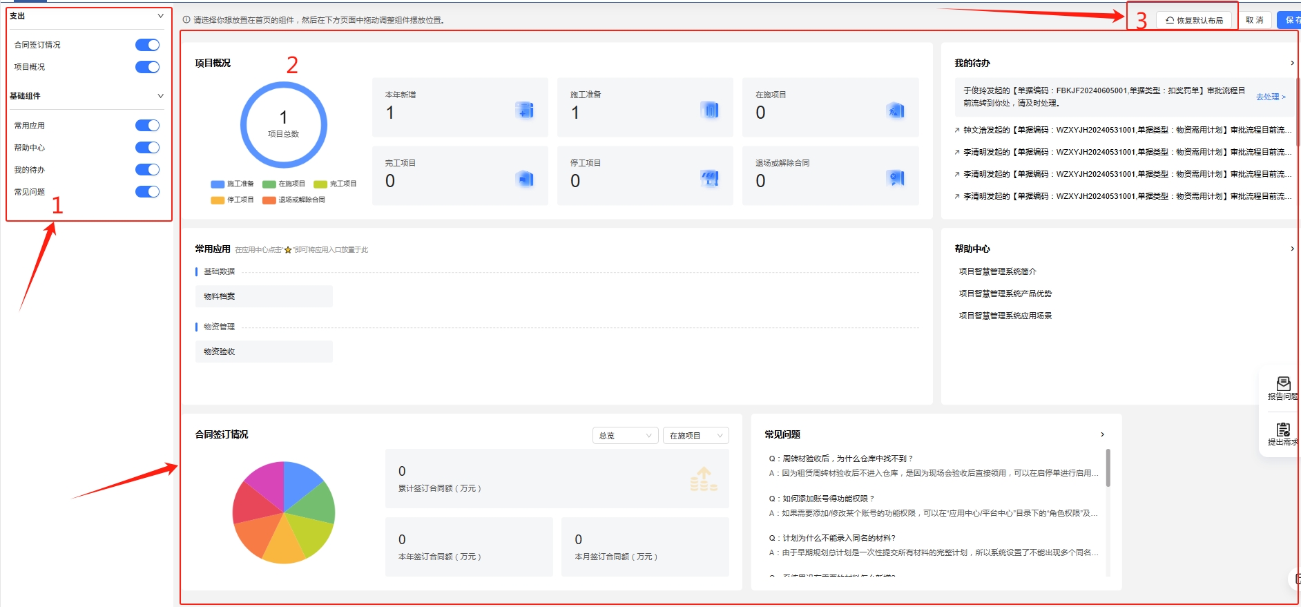 系统首页面,左上角--自定义首页,可进入到首页配置界面,可拖动各板块进行布局给调整