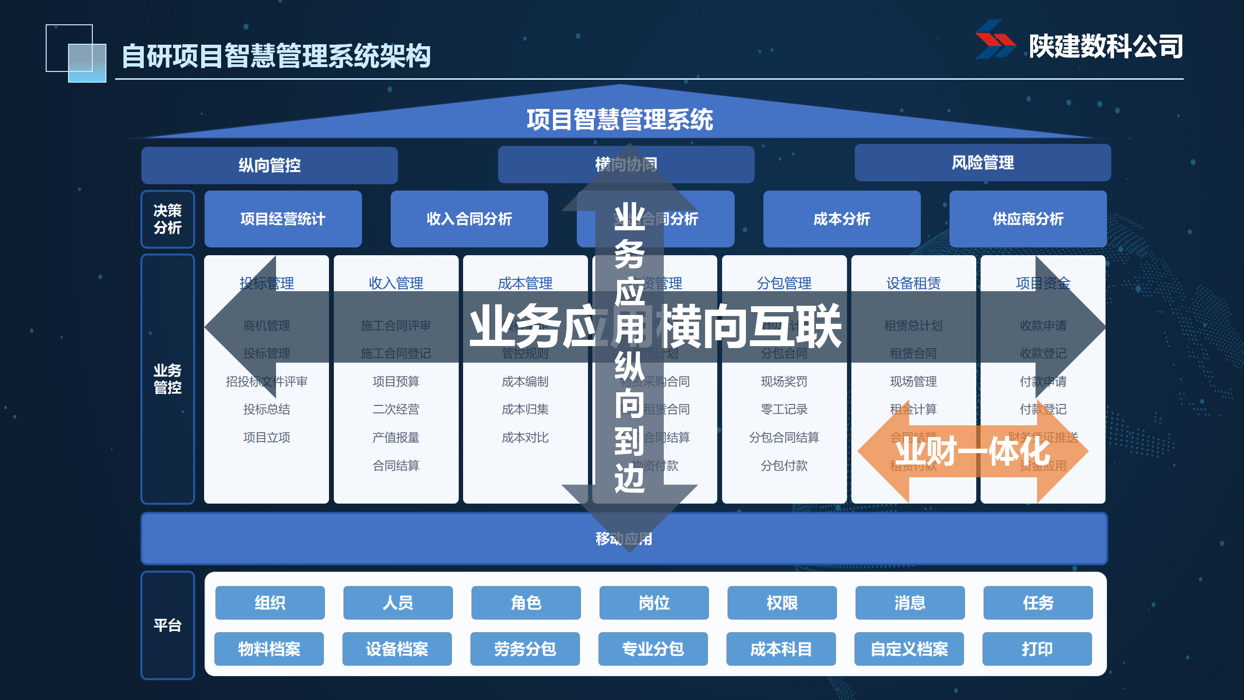 什么是项企通(项目智慧管理系统) 项目智慧管理系统简介¶ 项目智慧管理系统由陕建数科公司自主研发打造。能够在项目管理生命周期内,实现业务横向互联;在业务管理深度方面,实现应用纵向到边;此外还实现了业财融合,实现业财一体化。 设计理念:¶ 开放融合 - 打通现有各系统 高度灵活 - 采用微服务架构,功能结构模块化、组件化 量体裁衣 - 不只是软件乙方、也是陕建信息化的设计者