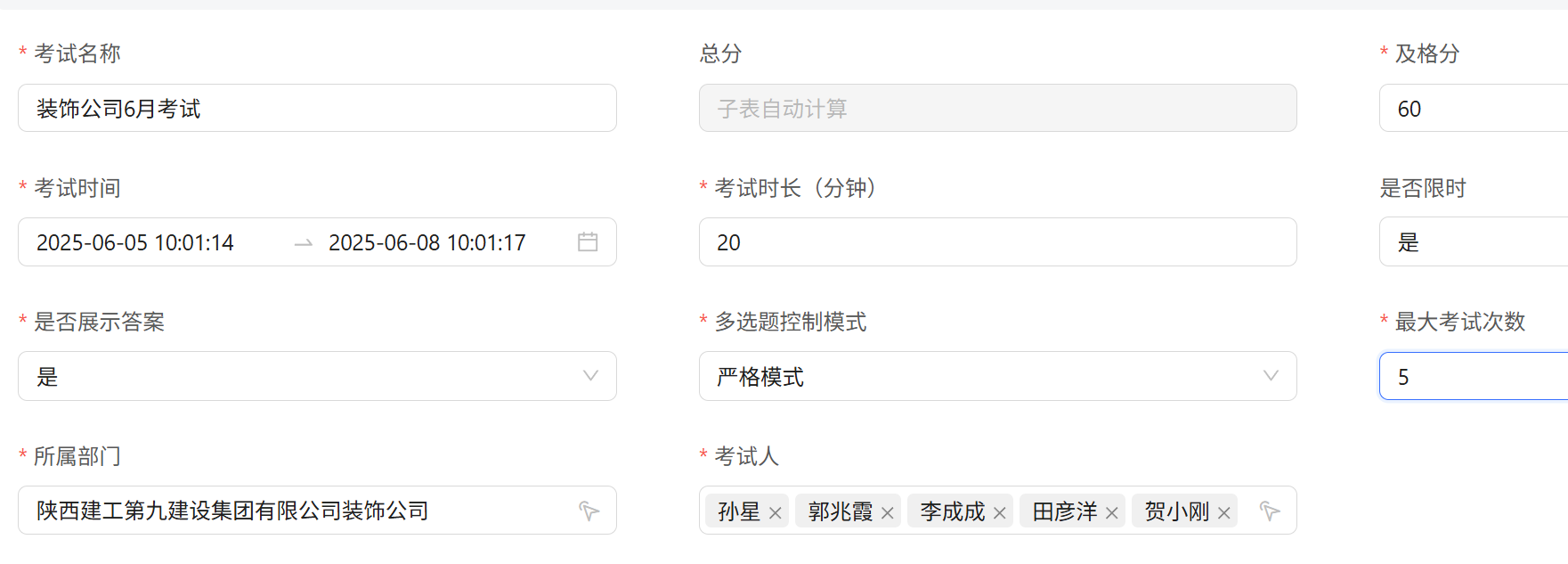 - 所属部门:选择了:"陕西建工第九建设集团有限公司装饰公司",表示这个只允许装饰管理员看到这个考试