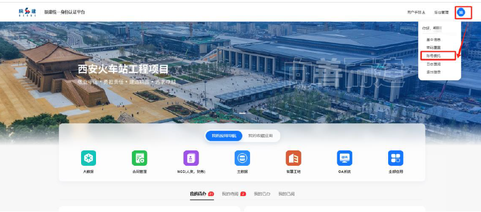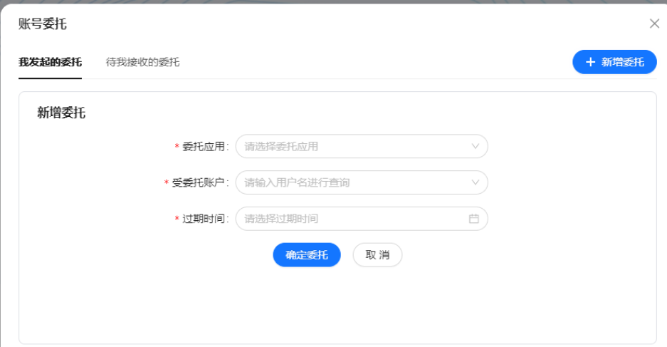 点击 新增委托”,可以选择需要委托别人访问操作的应用、受委托账户、设置委托过期时间,设置完毕后,点击“确定委托”。