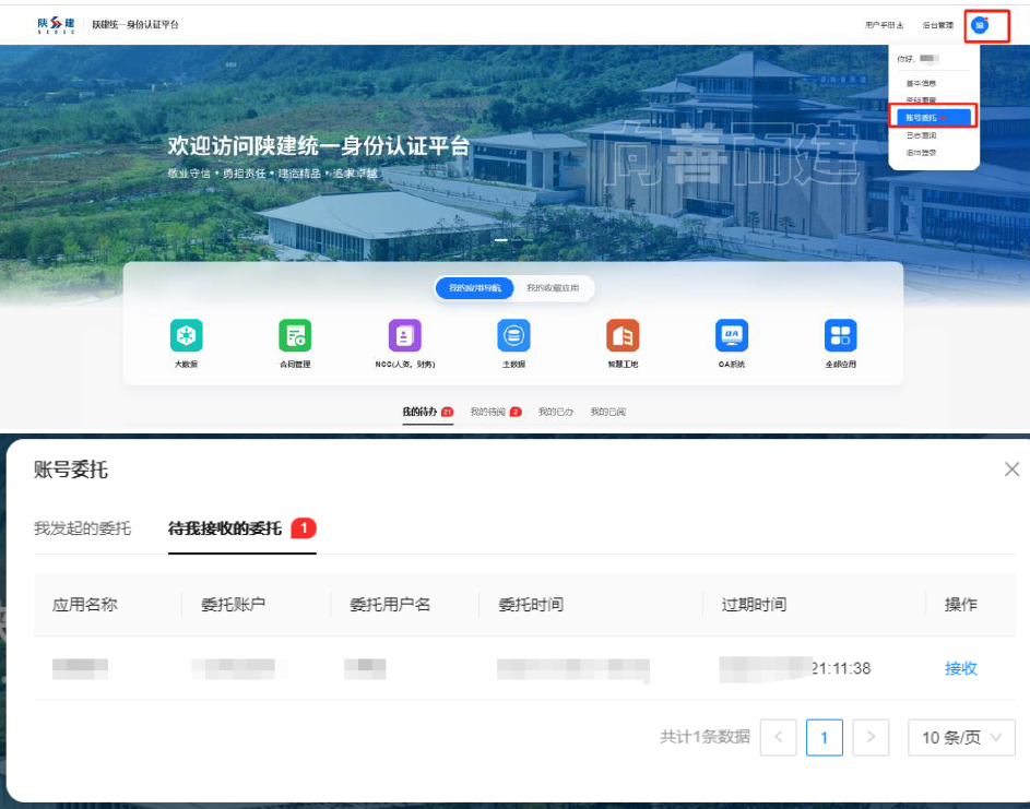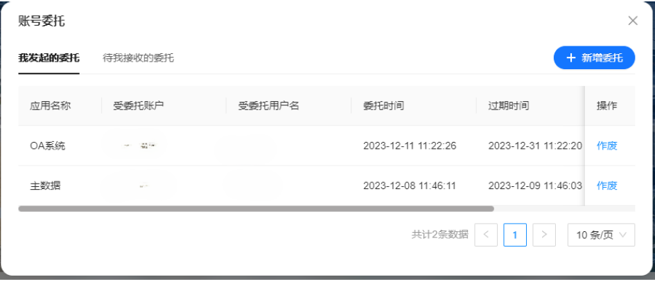 在账号委托处,可以看到“我发起的委托”、“待我接收的委托”列表。