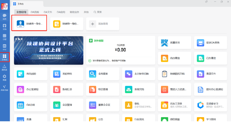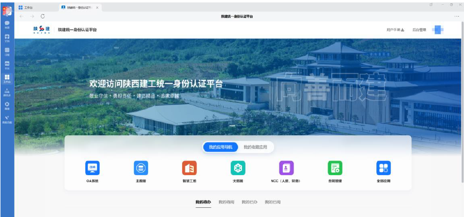 用户可在陕建集团企业微信PC 端或者手机端内,“工作 台”处点击“ 陕建统一身份认证 单点登录IAM 平台。