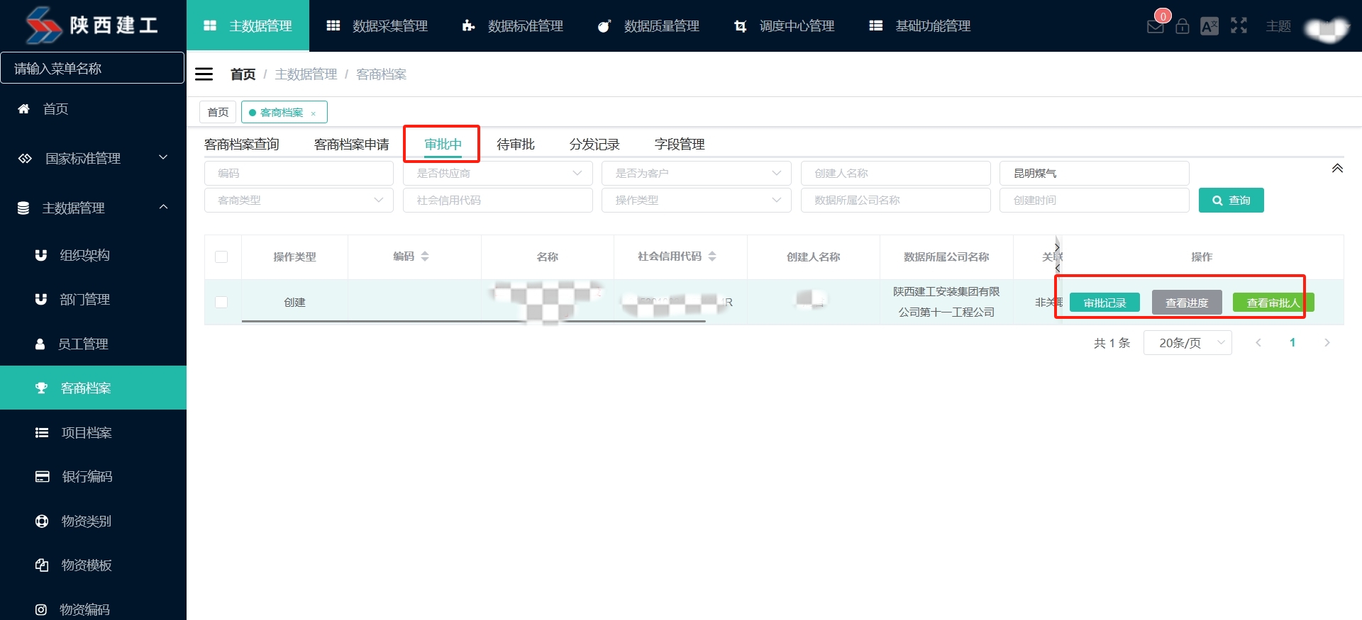 对于新建的数据,最简单的判断方法,就是在查询页面搜索该客商的名称,如果可以搜索到,就代表该客商审批已经完成。 对于修改的数据,如果在查询页面查到数据未修改成功,则代表审批还在进行当中。 另外,也可以直接在“审批中”页签查看审批状态,如下图:
