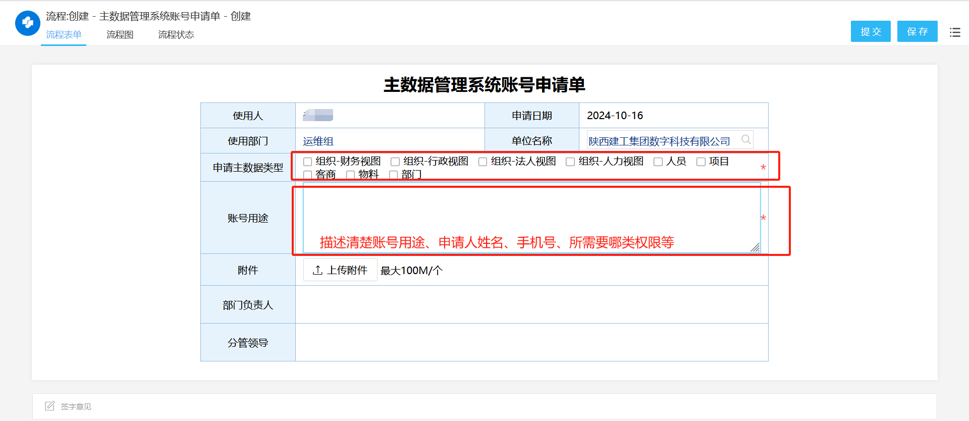 编辑完成后,即可提交。目前的审批流程为二级单位内部审批,需经过部门负责人及分管领导两级审批。本单位分管领导审批通过后,流程就会自动流转至主数据系统管理员。