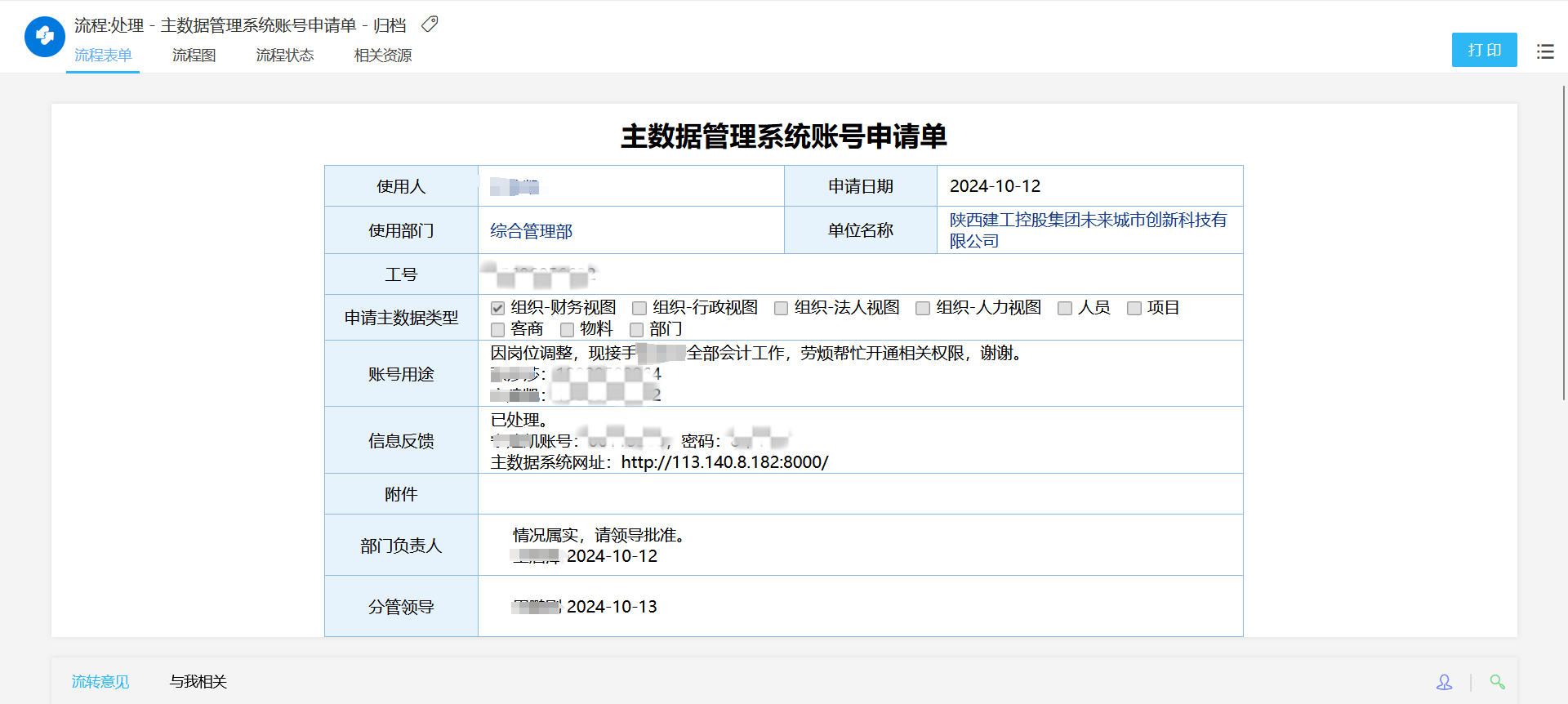 主数据系统管理员处理完毕,将账号权限开通好后,会将账号信息在该流程中的“信息反馈”进行回复。申请人便可以拿到账号信息进行登录以及后续操作处理了。如下图所示。(完毕)