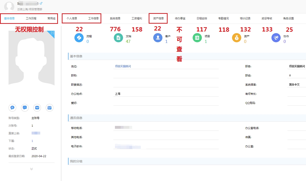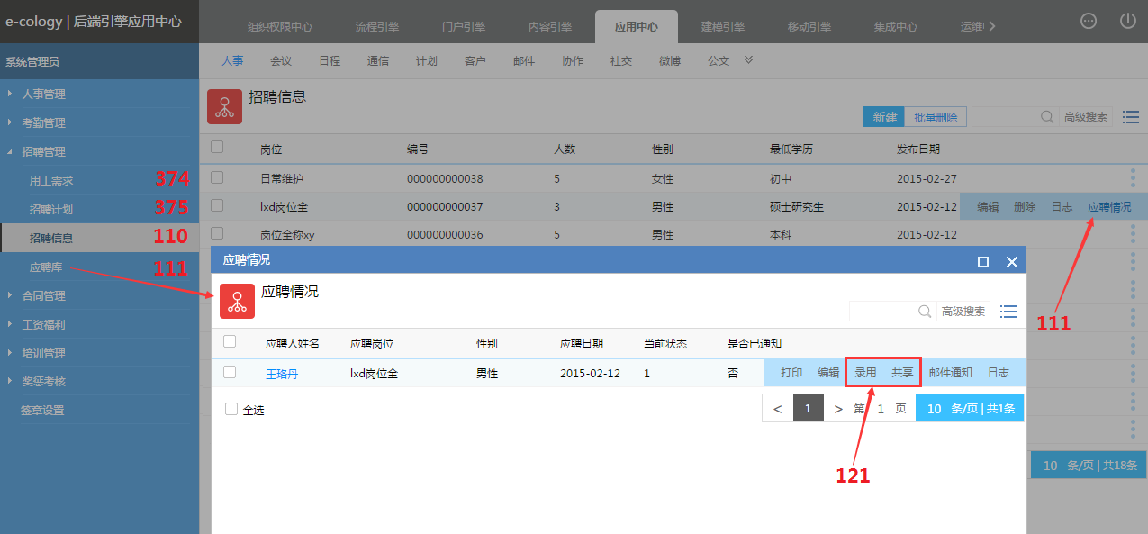 3)人事管理-招聘管理权限,在招聘信息页面,必需拥有【111-应聘信息维护】才能看到应聘人员,打开应聘人员页面后,还必须增加【121-应聘人录用】权限才能录用和共享应聘人;另外应聘库的页面内容与招聘信息-应聘情况页面一致,所以相关权限也一样