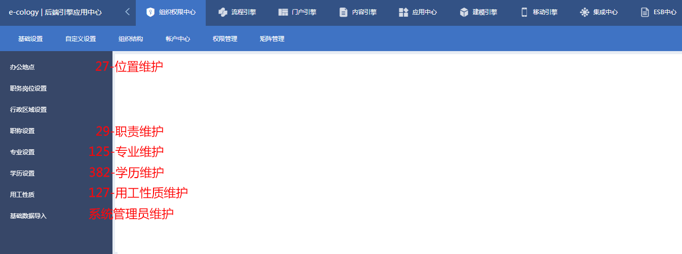 基础设置页面除了职务岗位设置和行政区域设置,其它菜单权限如下图所示