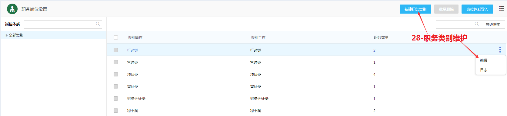 职务类别新建和编辑:28-职务类别维护;