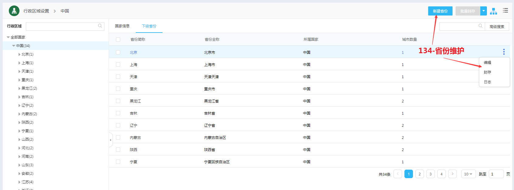 省份新建和编辑:134-省份维护;