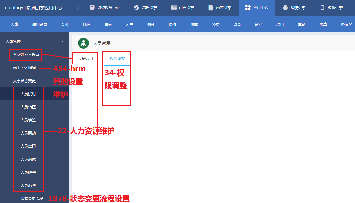 1)人事管理-人事状态变更下的菜单都有三个页面,第一个操作页面都必需拥有【22-人力资源维护】权限,第二个权限调整页面必需拥有【34-权限调整】权限