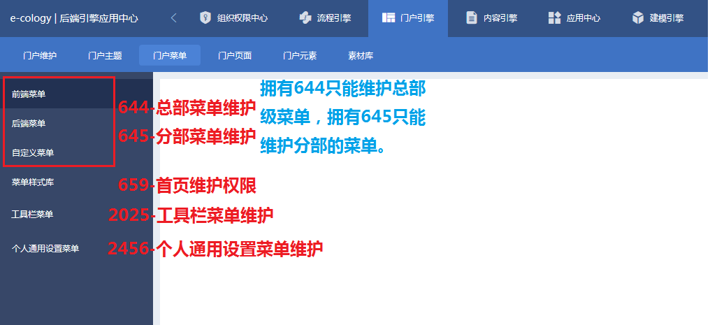 在维护前后端及自定义菜单的时候,拥有【644-总部菜单维护】权限,只能维护总部的菜单,不能维护分部的菜单,如果要维护分部菜单,必需拥有【645-分部菜单维护】,如果总部和分部都要维护必须两个权限都有