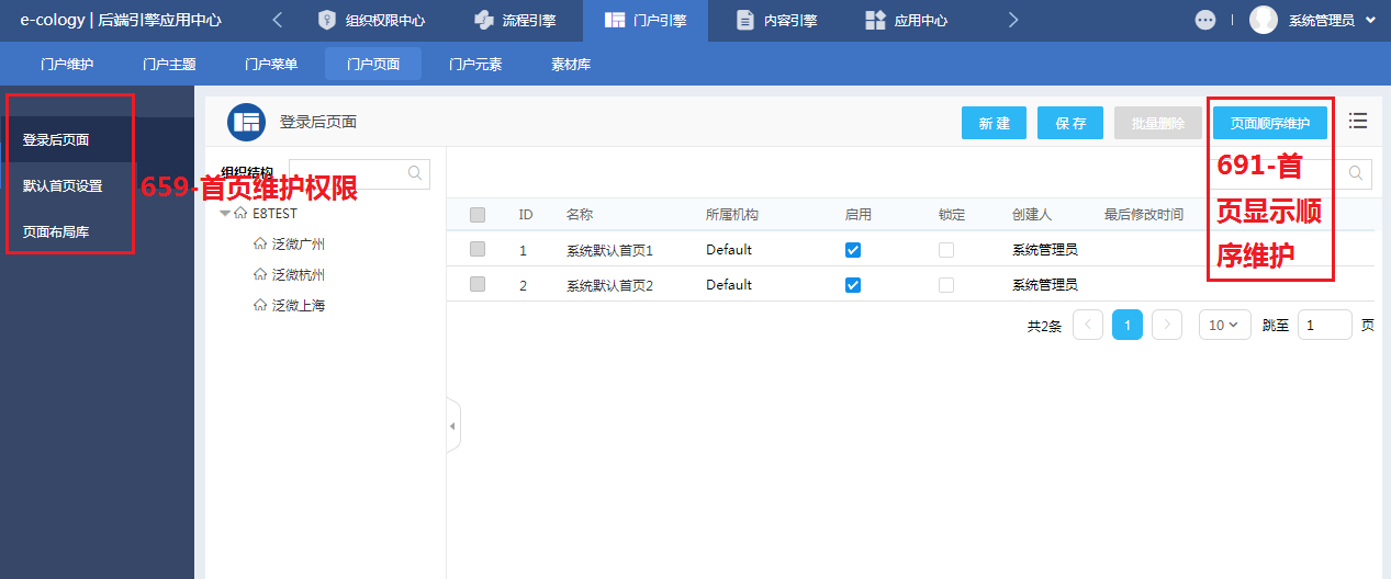 门户引擎-门户页面下的菜单都受【659-首页维护权限】菜单控制,但是在登录后页面中有{页面顺序维护}按钮,此按钮受【691-首页显示顺序维护】
