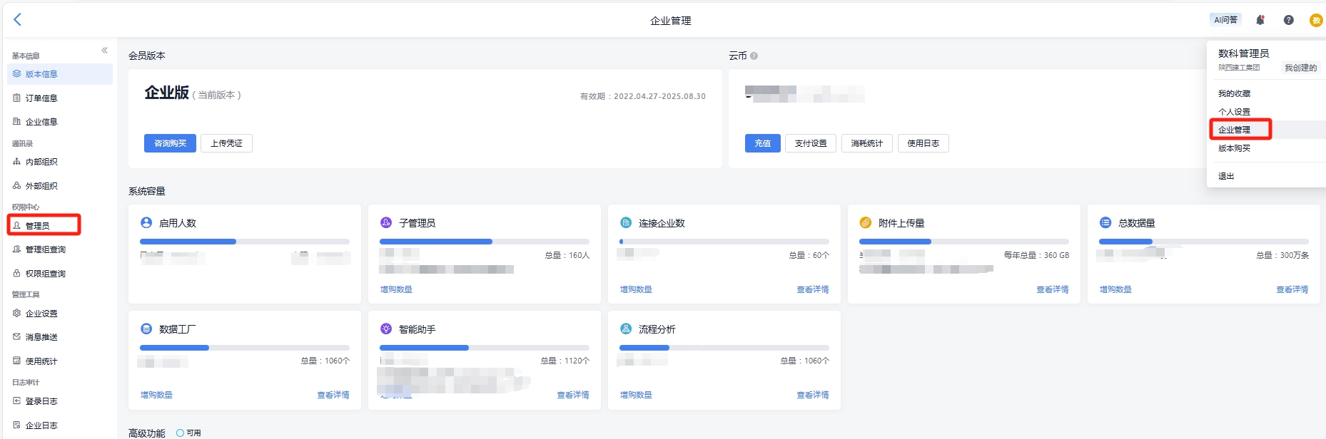 2)点击头像--->企业管理--->点击管理员,添加对应的管理人员,并添加需要管理的应用