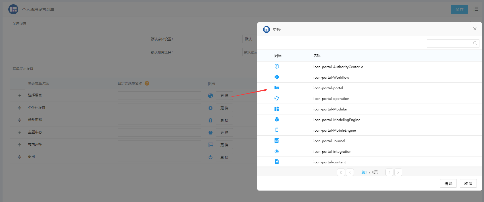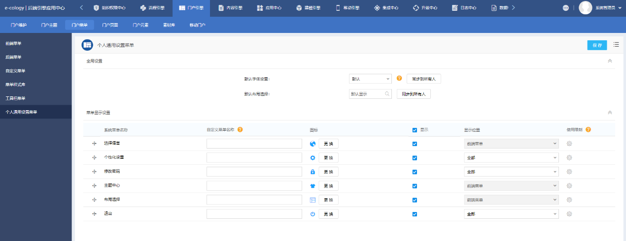 1)个人通用设置菜单可进行菜单项是否显示/菜单项名称更改/菜单项显示图标更换等操作