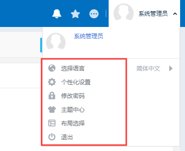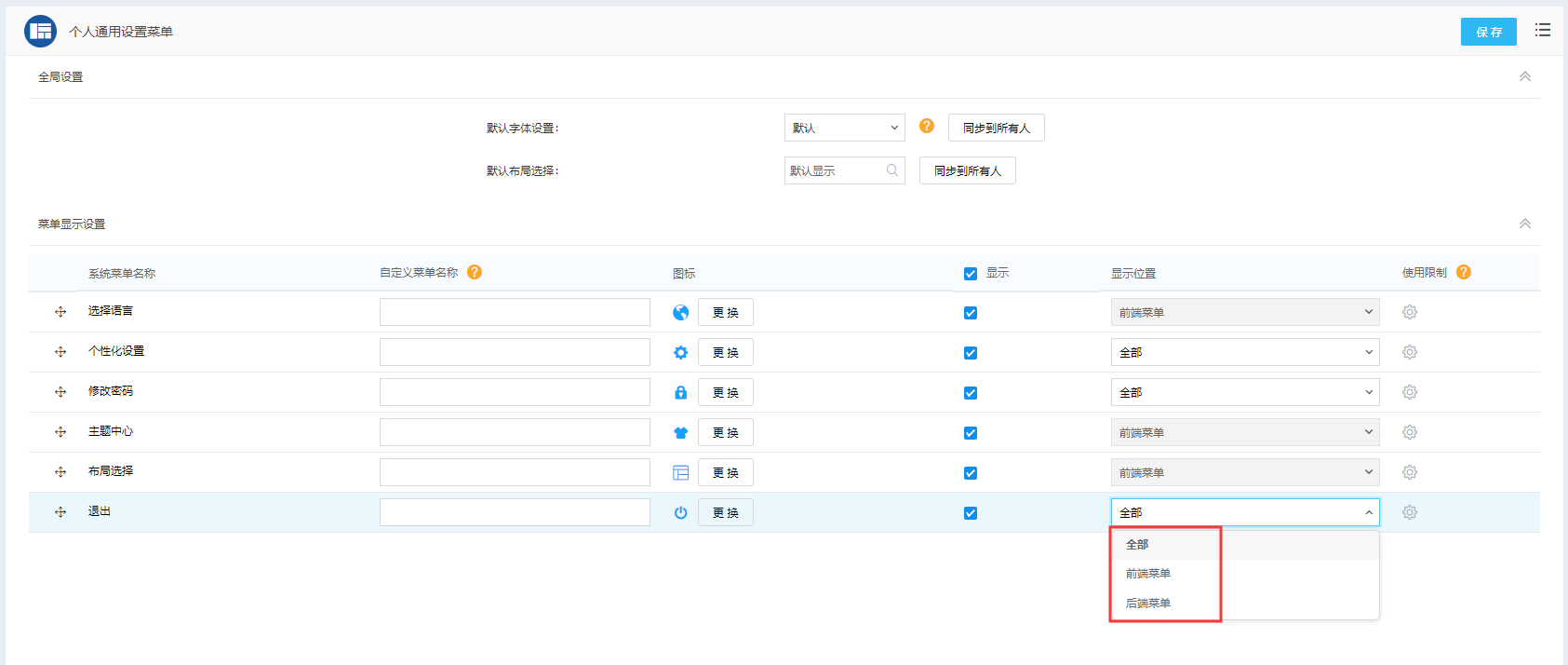 ④显示位置:个性化设置、修改密码和退出可以自定义显示位置,可以只在前端或后端显示,也可以前后端同时显示;