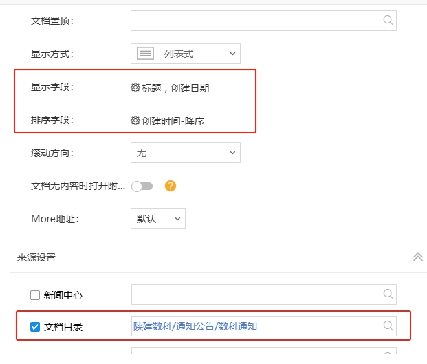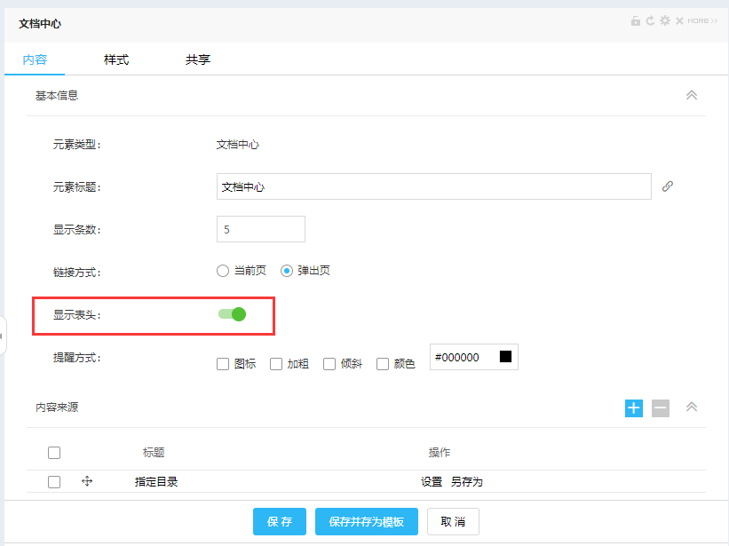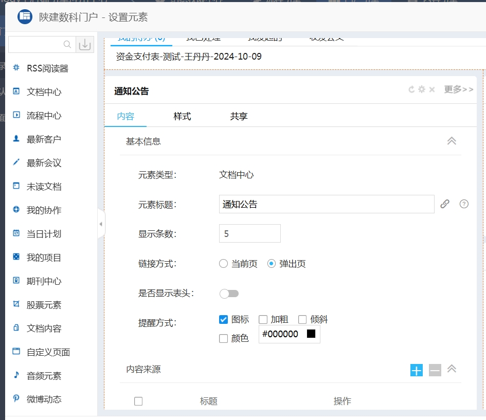 5)再添加的文档中心元素的内容页面,添加内容来源