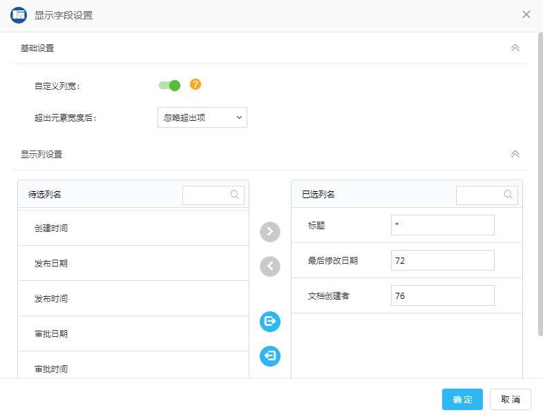 4)每个元素都可以自定义显示列字段宽度,以文档中心举例说明,点开文档中心元素显示字段后如下