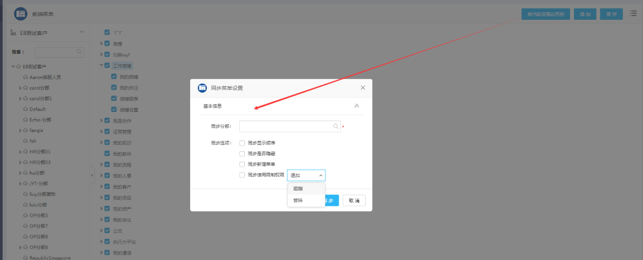 菜单同步功能是将某个分部或总部菜单的设置同步到其它分部中,点击【将当前设置应用到】可以同步对应分部的所有菜单,在某个指定菜单点击【同步】可以单独同步此菜单及下级菜单