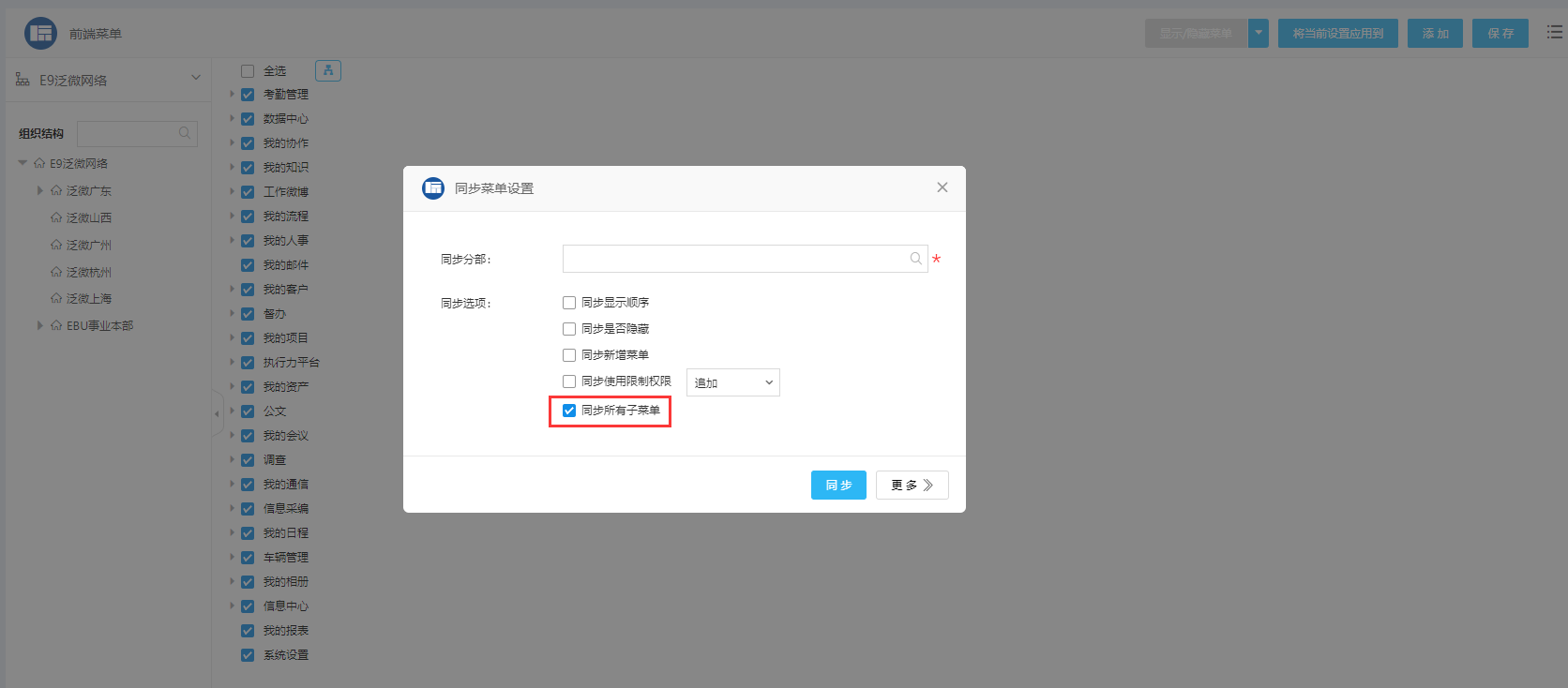 ⑤同步所有子菜单:在同步单个菜单时,多出一个同步所有子菜单的选项,用于设置同步该菜单的所有子菜单。