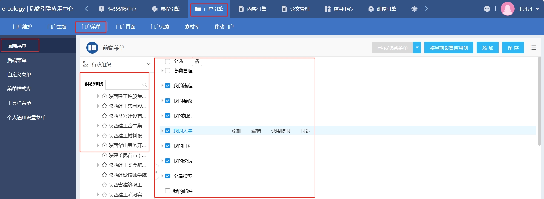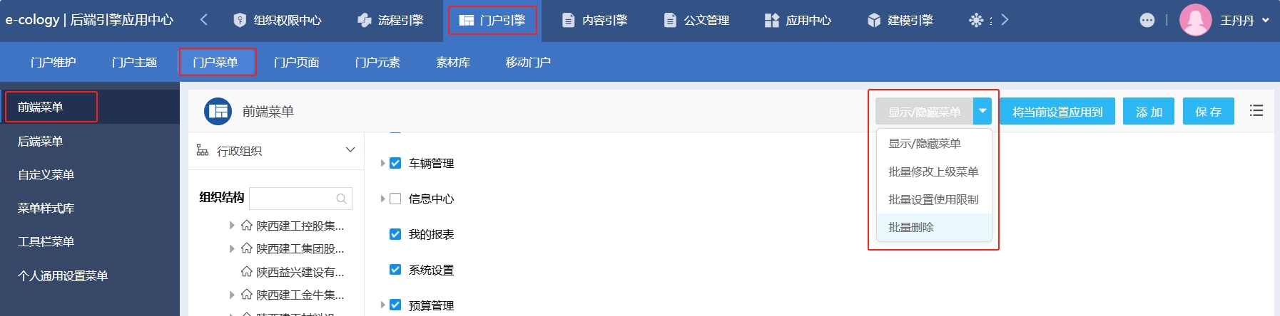 1)点击后端门户引擎→门户菜单→前端菜单,可以查看单位的前端菜单