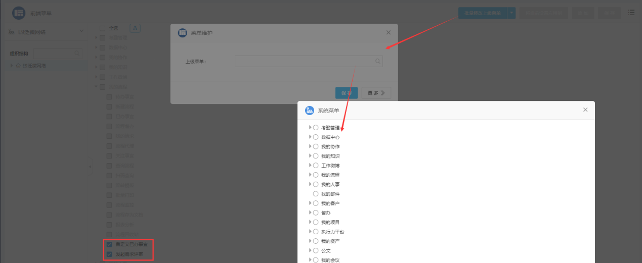 2)选择按钮组中的【批量修改上级菜单】并勾选所要修改的菜单后,点击按钮即可进行批量修改操作