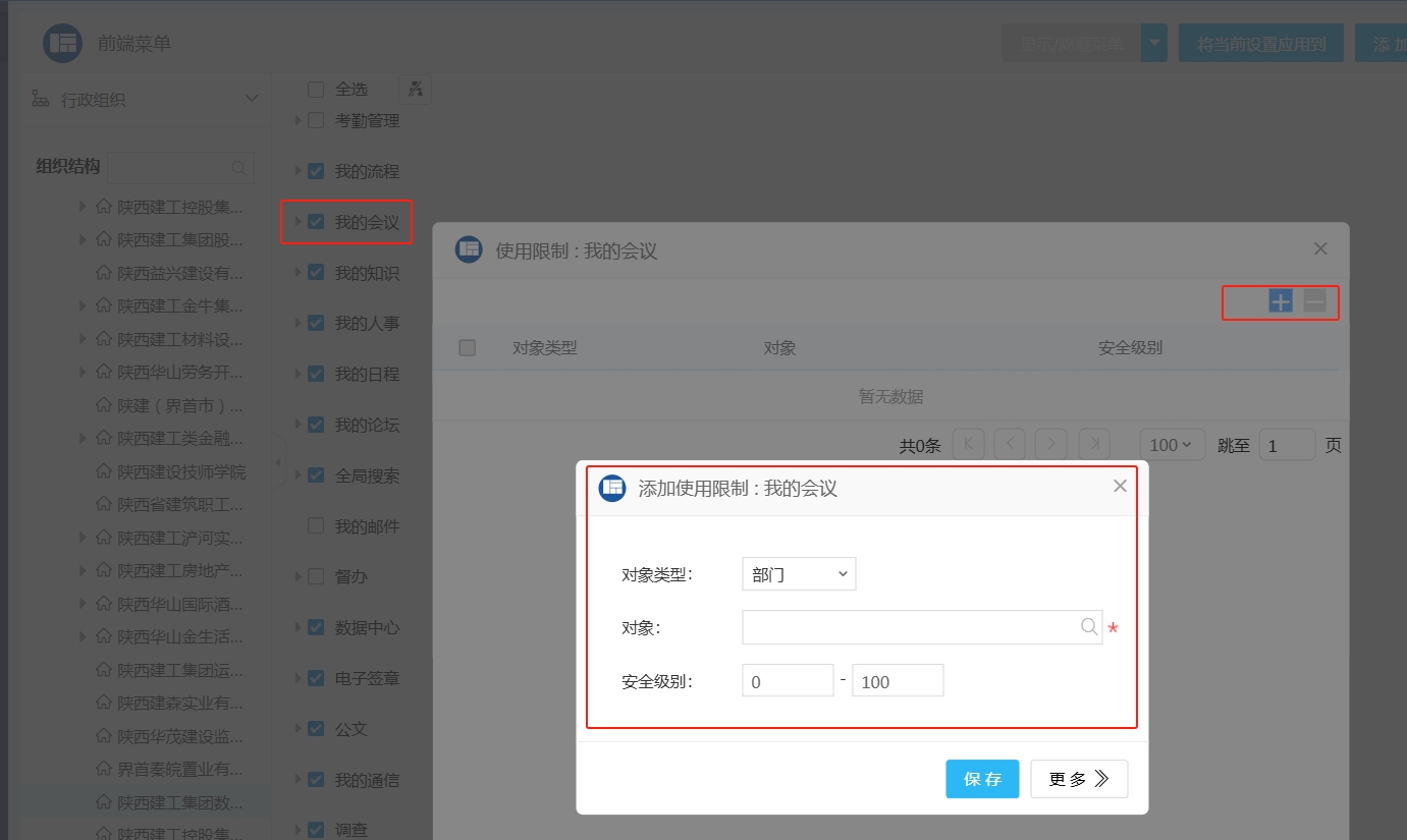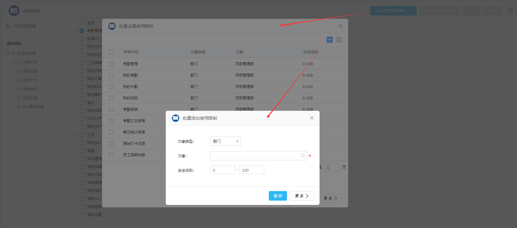 3)菜单也可以设置对应的使用限制,添加对应的人员、部门、分部、岗位等