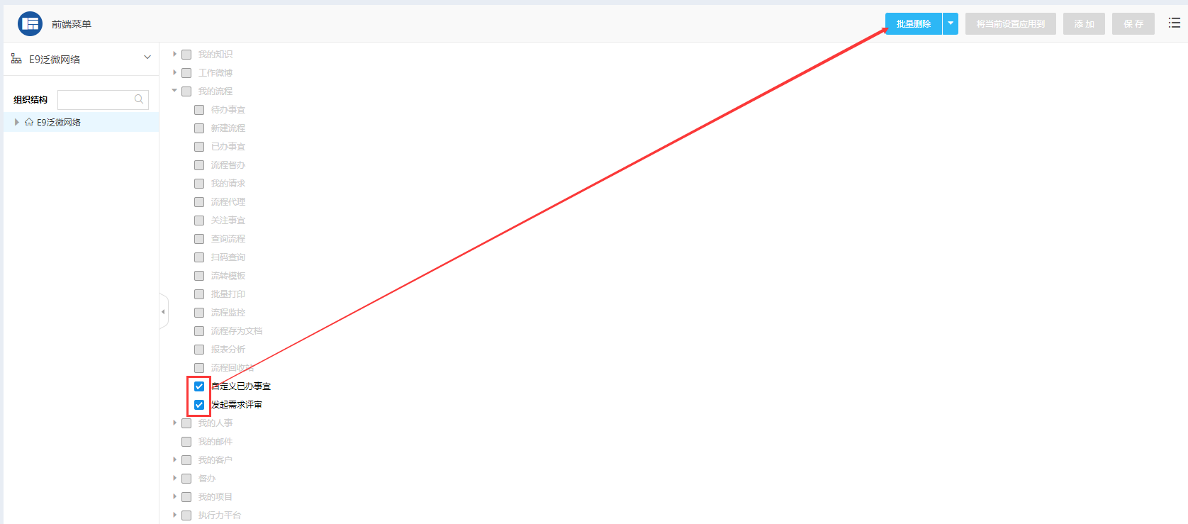 4)选择按钮组中的【批量删除】,只有自定义菜单才可以选择,选中要删除的菜单后再点击【批量删除】按钮,可以批量删除选中的自定义菜单