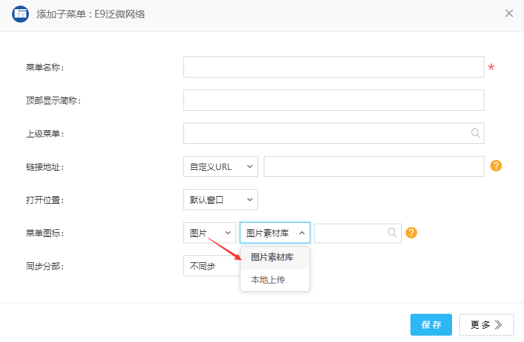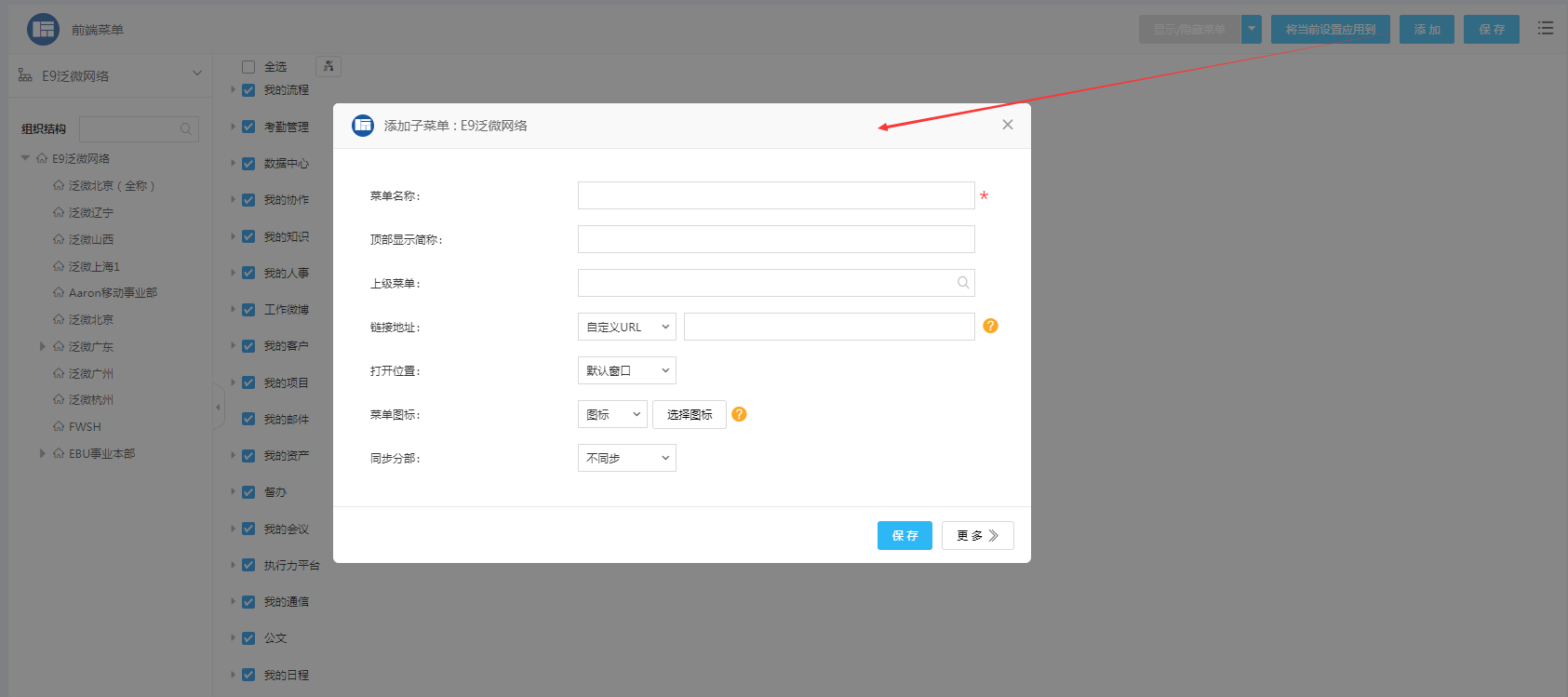 同步到指定分部:需要选择同步的分部,保存后会将新增菜单同步到指定分部菜单中。