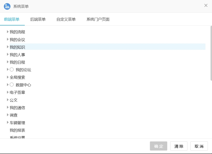3)链接地址选择【系统菜单】方式后,点击浏览按钮显示如下,选择一个且只能指定一个菜单作为此自定义菜单的链接地址,系统门户页面是管理员在门户页面中添加的门户。