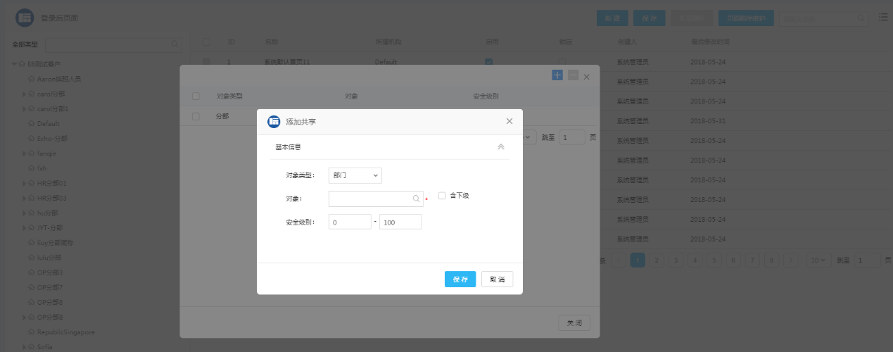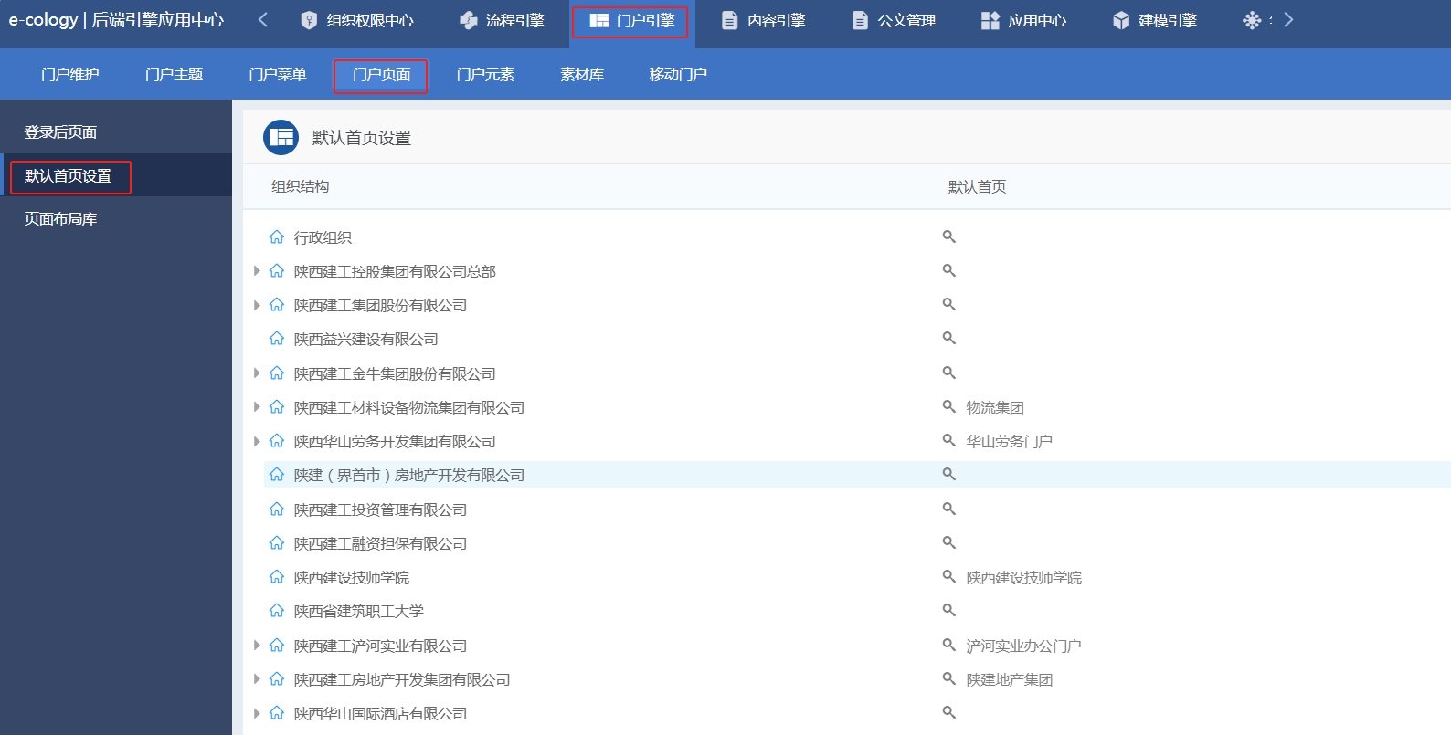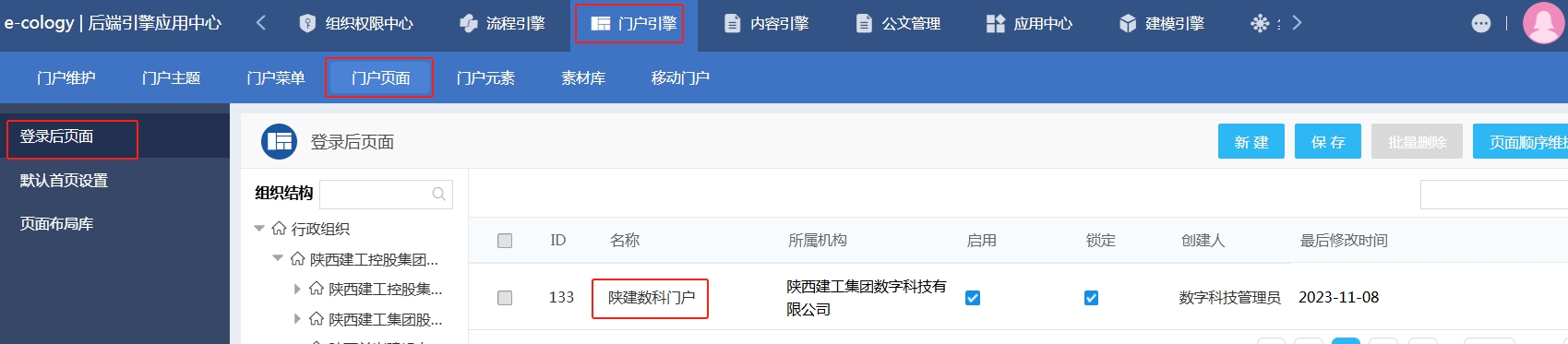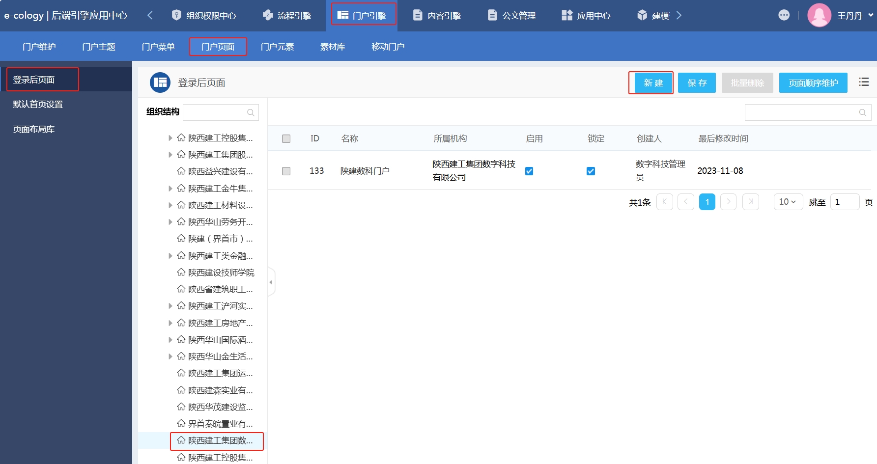1)后端点击门户引擎→门户页面→登陆后页面→点击对应的组织架构,然后点击新建