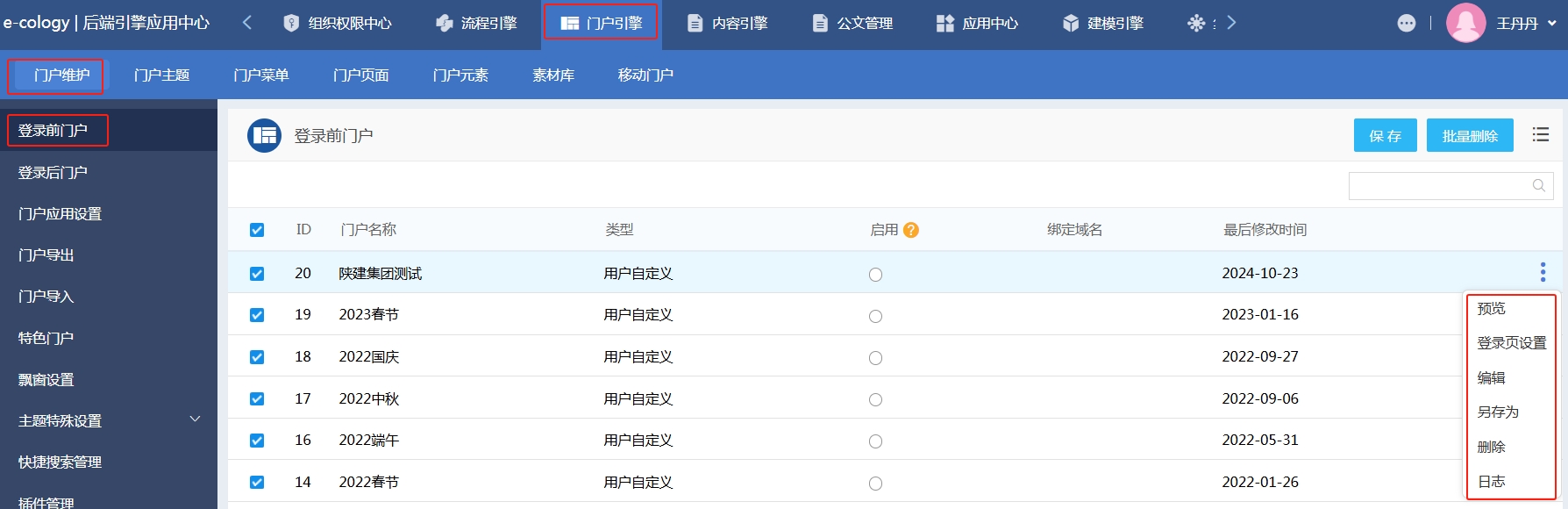 1)选中自定义的门户后点击【批量删除】按钮可以删除非系统默认登录前门户