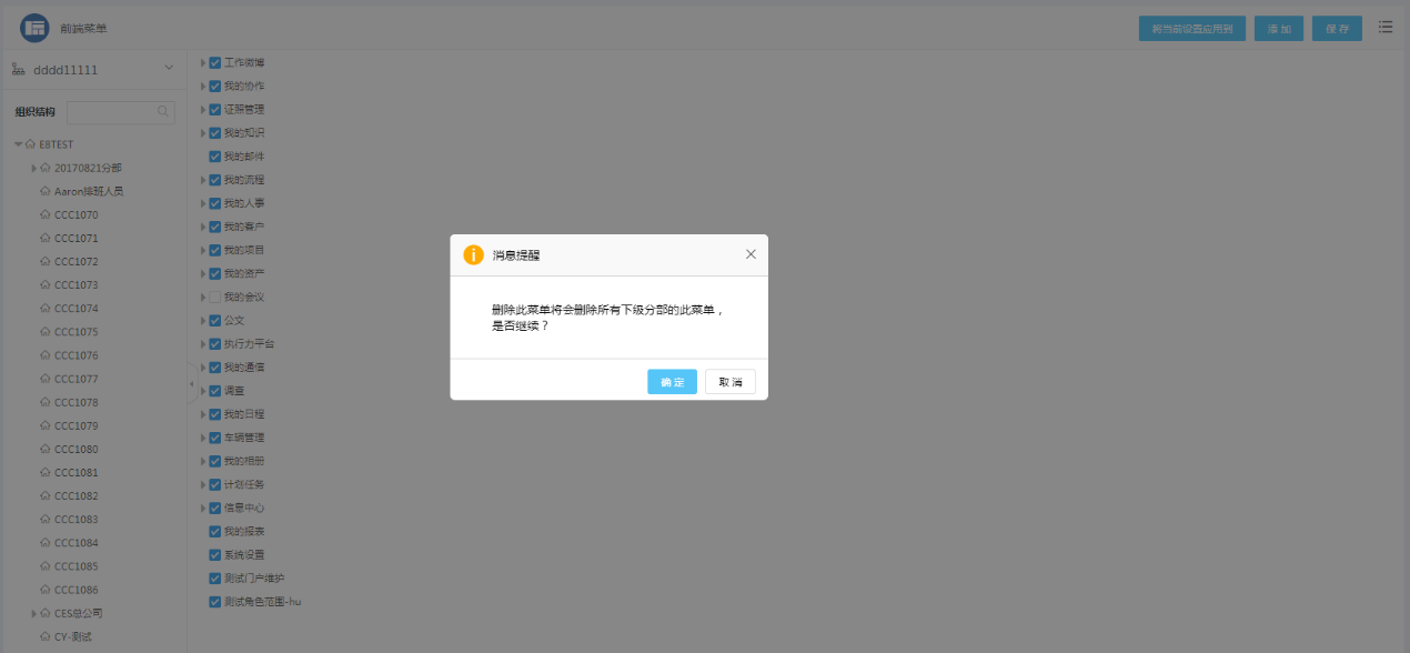 ④删除:点击后可以删除此菜单,只有自定义菜单才能删除,系统菜单不能删除,只能隐藏,删除自定义会删除所有下级分部的此菜单,系统会给出提示,确认后菜单删除;