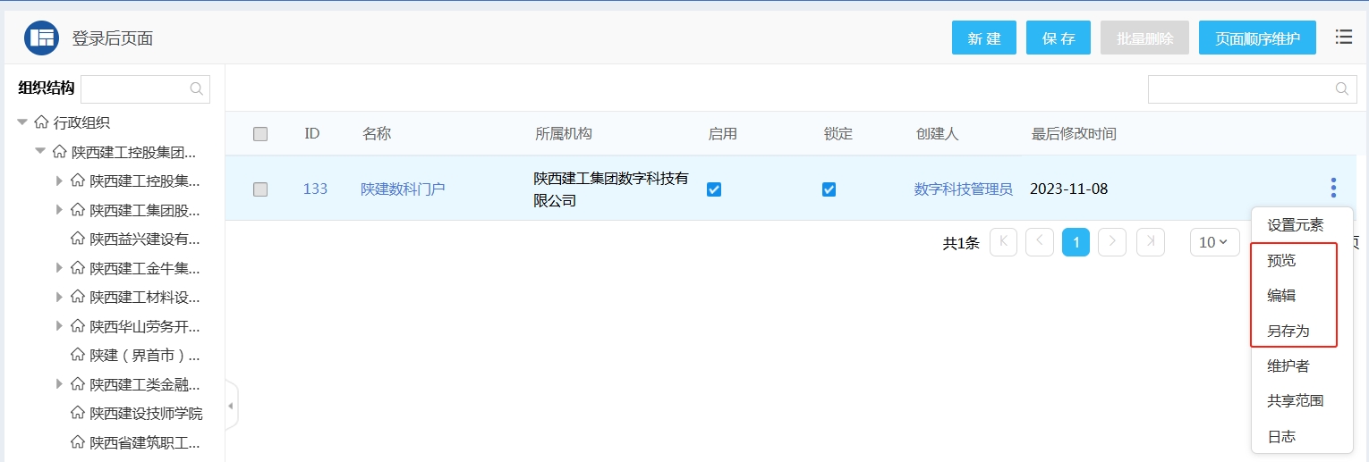 5)列表菜单【另存为】是以当前门户为模板创建一个自定义的登录前首页,登录前页面是没有【新建】按钮的,只能通过这种方式进行创建