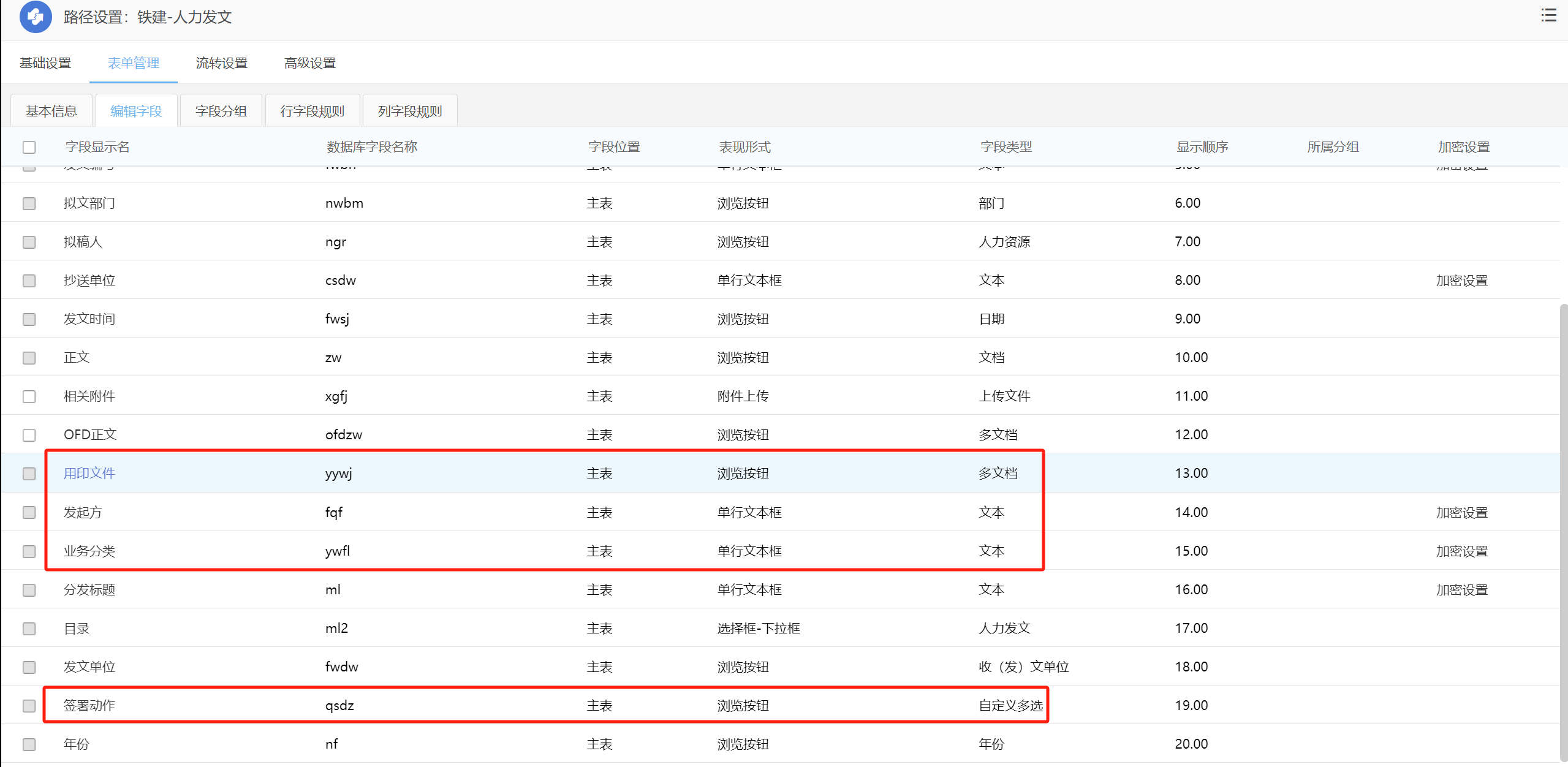 (1)创建公文管理流程:表单字段注意,正文字段必须是浏览文档,单文档;PDF公文必须字段必须是浏览按钮,多文档;主送单位、抄送单位、主办单位必须是浏览按钮,收(发)文单位;文号必须是单行文本;发文类型必须是选择下拉框(不同类型套不同的模板);印发机关字段可以选择图片字段--->拟稿单位--->选择显示方式(一般为嵌入式方式插入),设置在公文管理--->公文规范--->机构代字(根据分部设置)可以用于直接插入选择方式中。