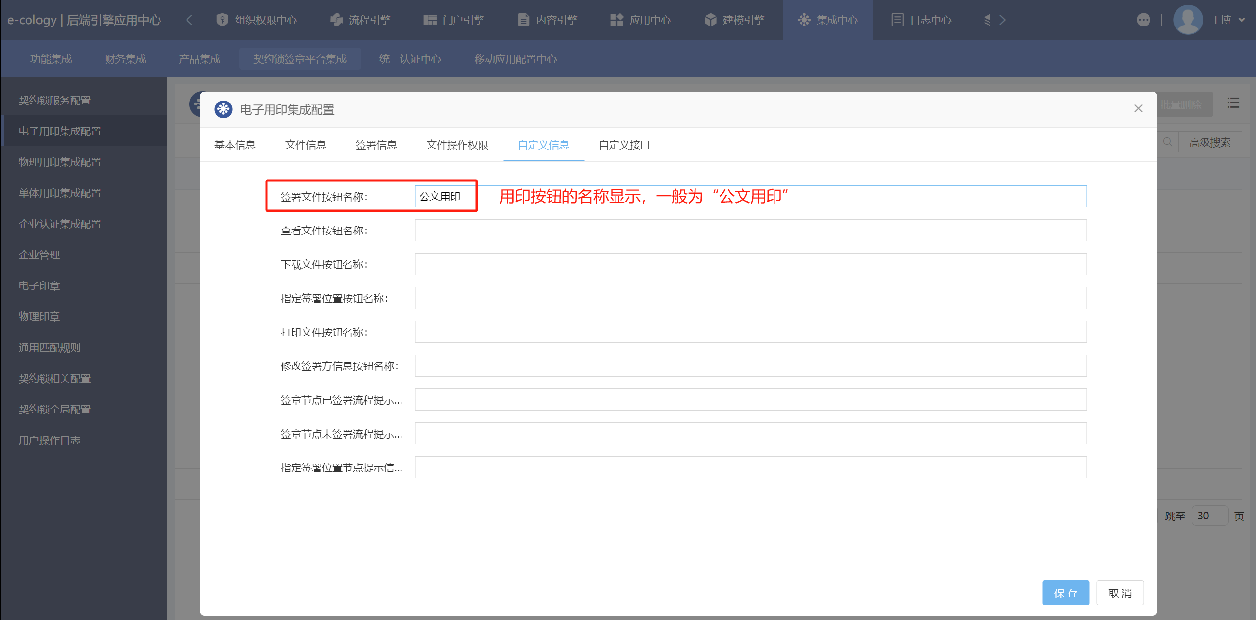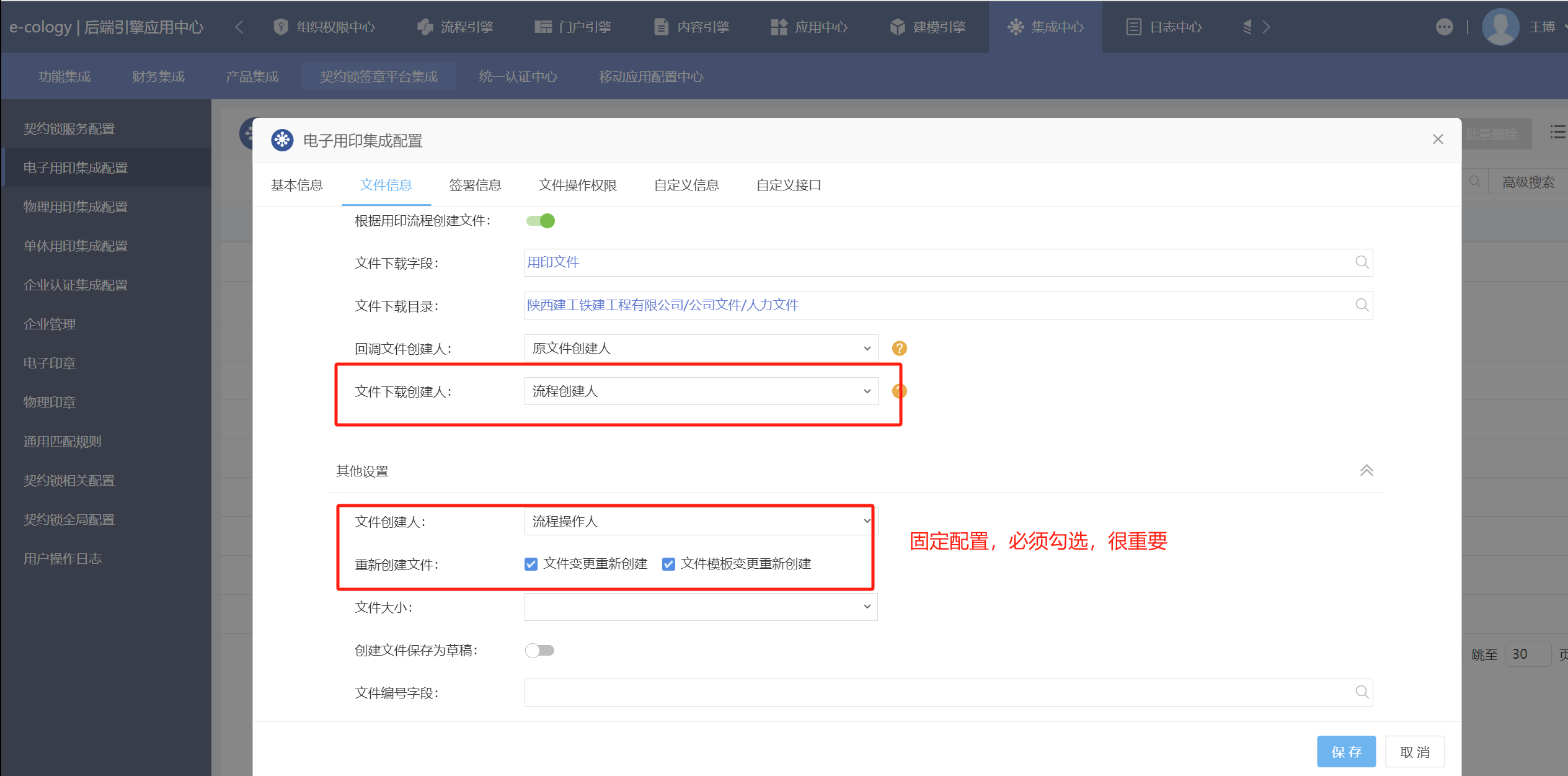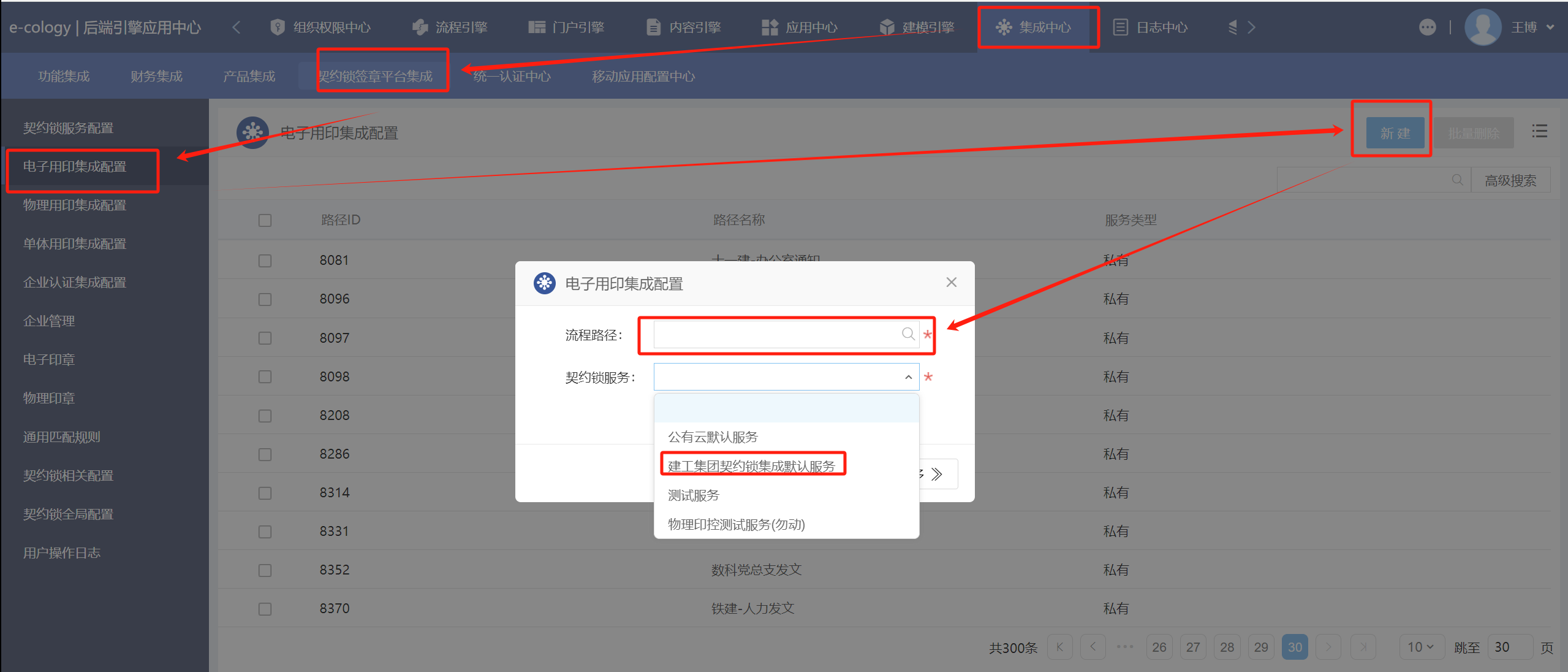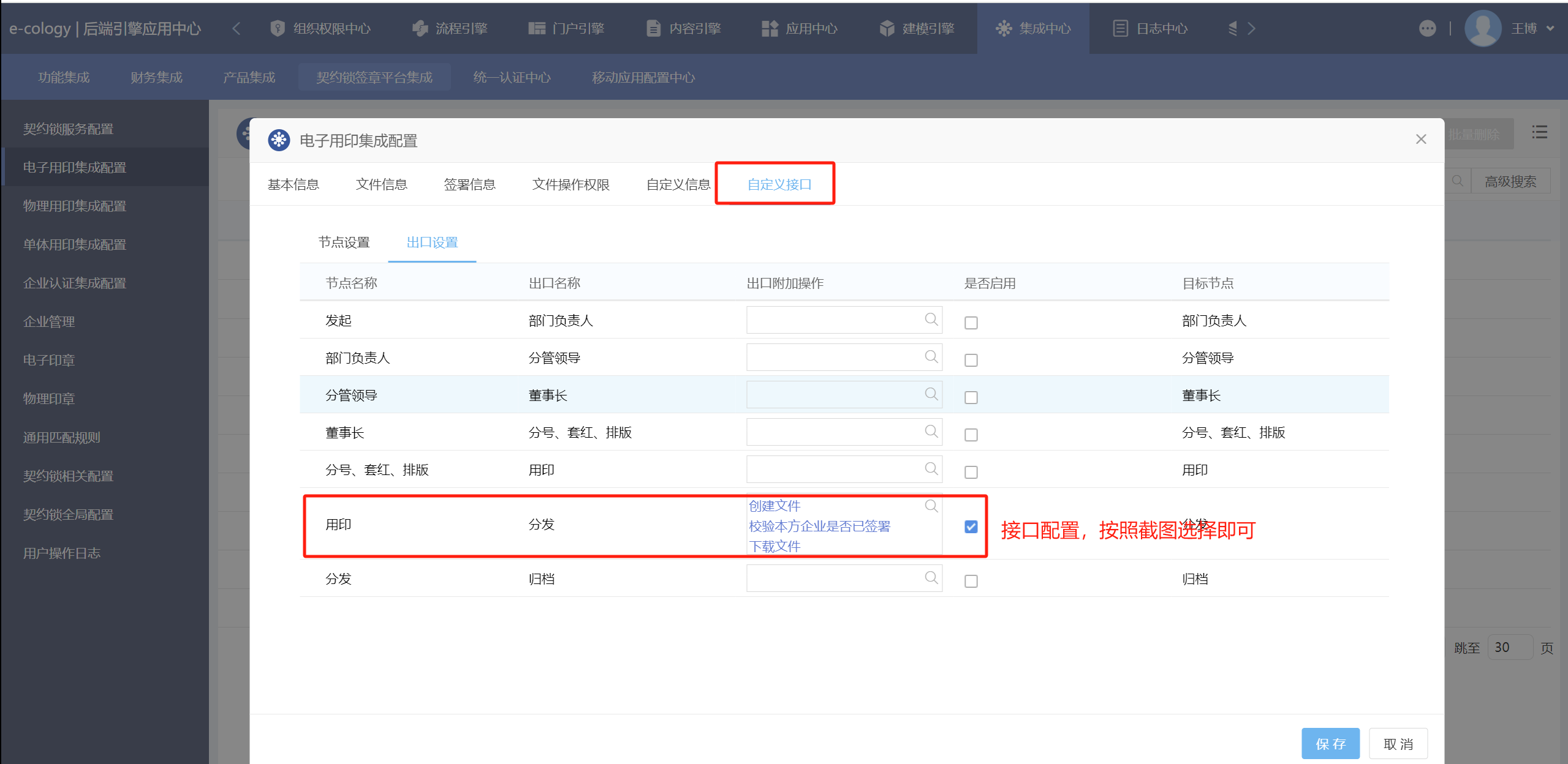 集成中心下为该流程配置契约锁用印功能,选择“流程路径”和“契约锁服务”后点击保存按钮即可。